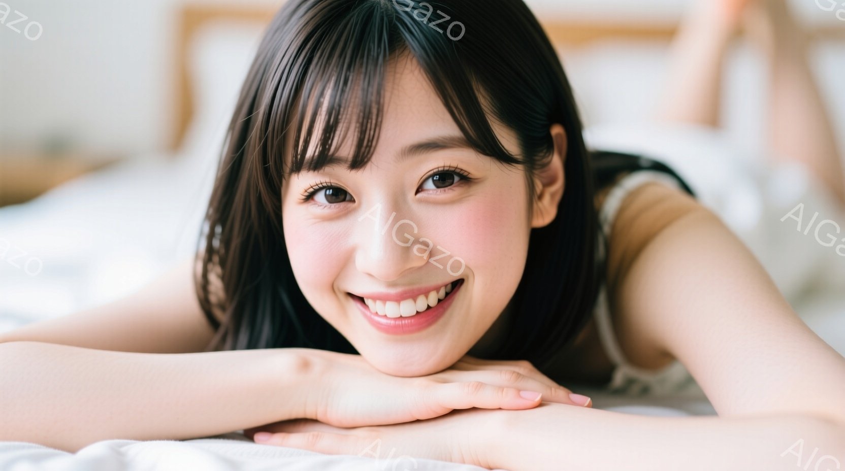 明るい笑顔の若い女性が、白いベッドの上に横たわっています。彼女は肩出しのカラフルな花柄のワンピースを着ており、黒髪のショートヘアをしています。彼女の姿勢はリラックスしており、両腕を前に伸ばしてベッドに支え、カメラに向かって楽しそうに微笑んでいます。