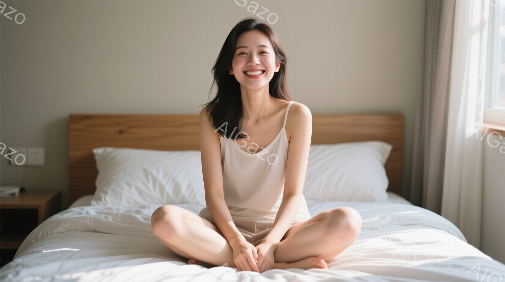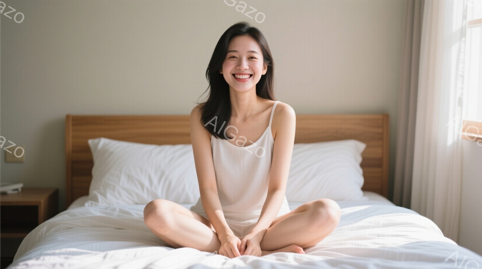 白いTシャツとグレーのショートパンツを着た女性が、白いベッドの上に座って微笑んでいます。彼女は足を組んで座っており、髪は肩にかかる長さで、自然なストレートヘアです。背景はシンプルな寝室で、柔らかい光が差し込んでおり、リラックスした穏やかな雰囲気を醸し出しています。