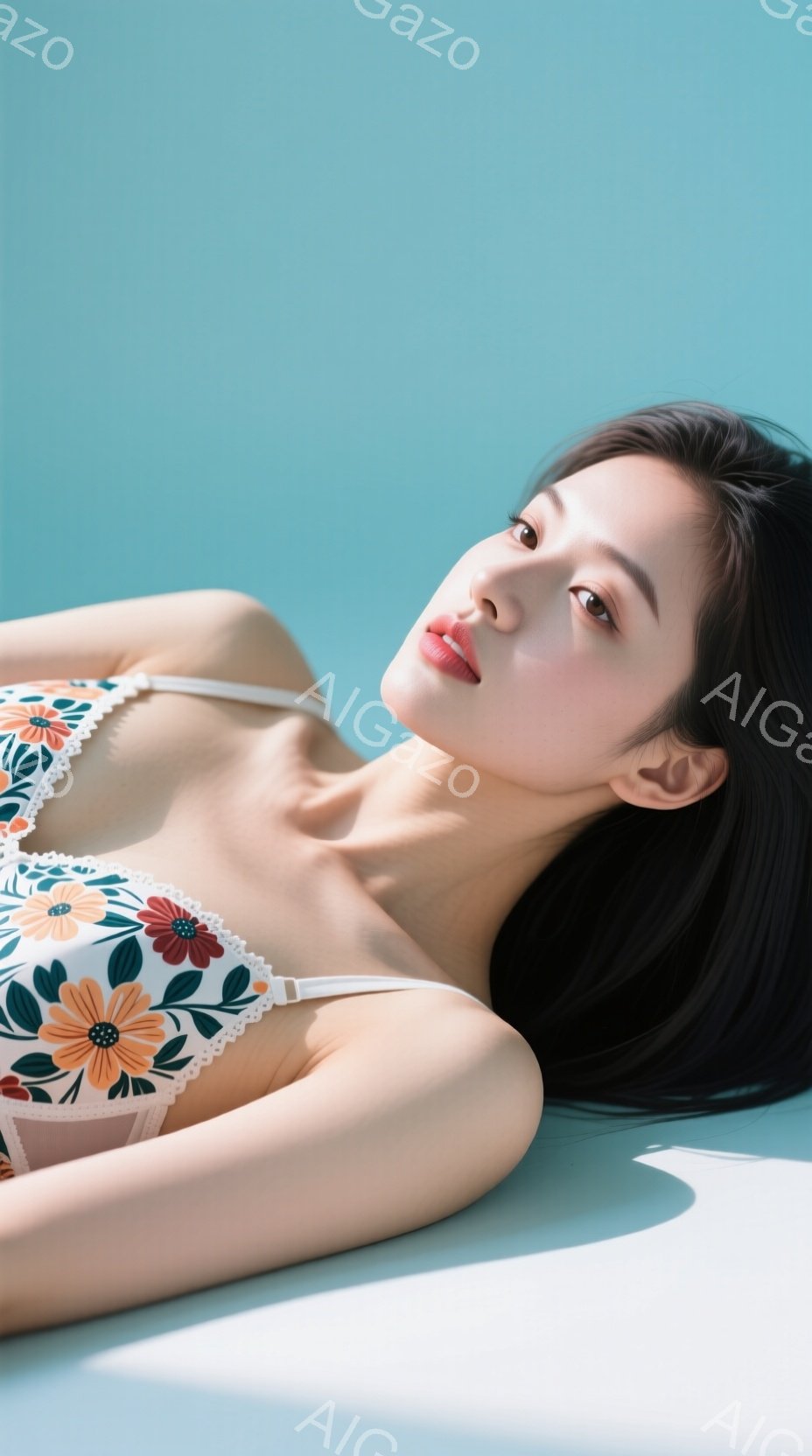 「長い黒髪の女性が白いベッドの上に仰向けに寝ています。彼女は肩出しの、花柄のブラレットを身に着け、少し口を開けてカメラを見つめており、穏やかでリラックスした表情を」は、2025年11月27日に作成されたAI生成画像です。 ファッションをテーマとした高品質なビジュアル素材で、 928×1664px の解像度で提供しています。 個人利用・商用利用ともに無料でダウンロード可能で、クレジット表記も不要です。