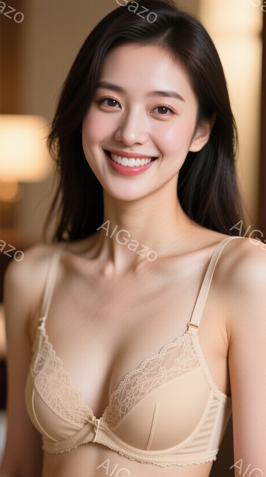 長い茶色の髪を肩にかけた女性が、ベージュ色のレース付きブラレットを着用し、優しく微笑んでいます。彼女は正面を向き、リラックスした姿勢で、穏やかで自然な雰囲気を醸し出しています。背景はぼやけていますが、暖かい色の壁と窓が見え、室内であることがわかります。