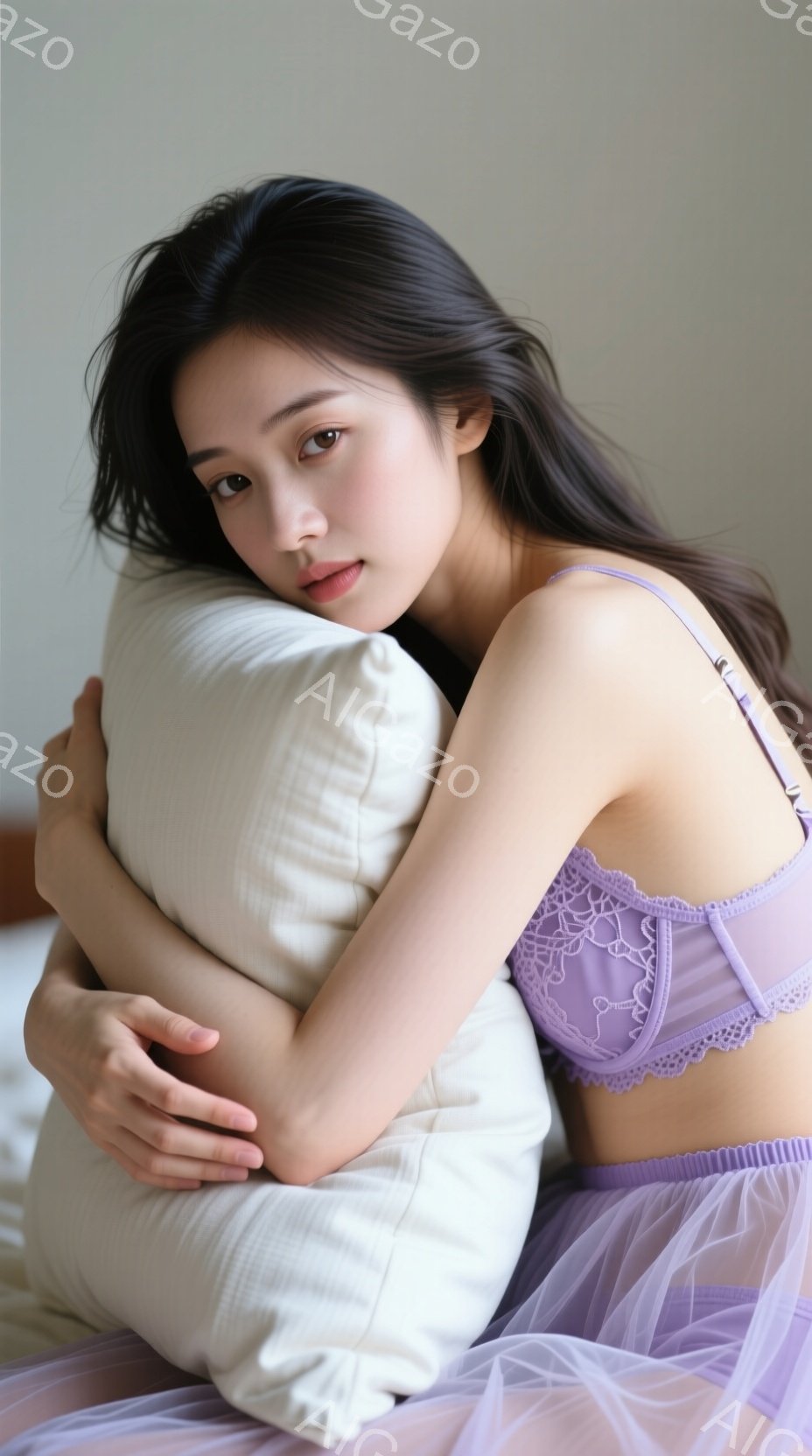 長い黒髪の女性が、薄紫色のレースのブラとスカートを身に着け、白い枕を抱きかかえています。彼女は穏やかな表情で、少し微笑んでいるように見え、リラックスした姿勢でベッドに座っています。背景はぼやけており、淡い色調で、全体的に柔らかく、ロマンチックな雰囲気を醸し出しています。