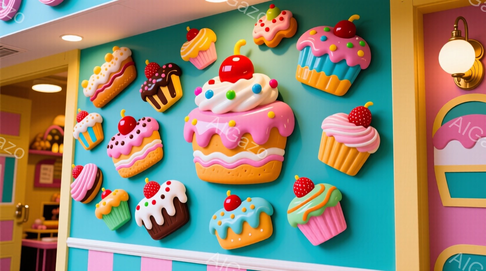 明るい水色の壁に、色とりどりのドーナツとカップケーキの立体的な装飾が並んでいる。それぞれのスイーツは、まるで本物のようなリアルな質感と鮮やかな色彩で、遊び心と楽しさを演出している。白い装飾のモールディングが施された下部と、天井からのスポットライトが、この空間をより一層魅力的にしている。