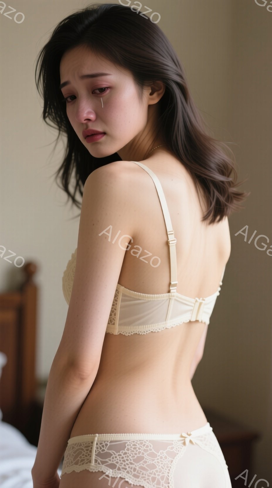 長い黒髪を肩にかけた女性が、クリーム色のレースのブラジャーとショーツを身につけて立っています。彼女は少し悲しげな表情で、視線はカメラから外れています。背景はベッドと壁で、全体的に柔らかく、内省的な雰囲気が漂っています。