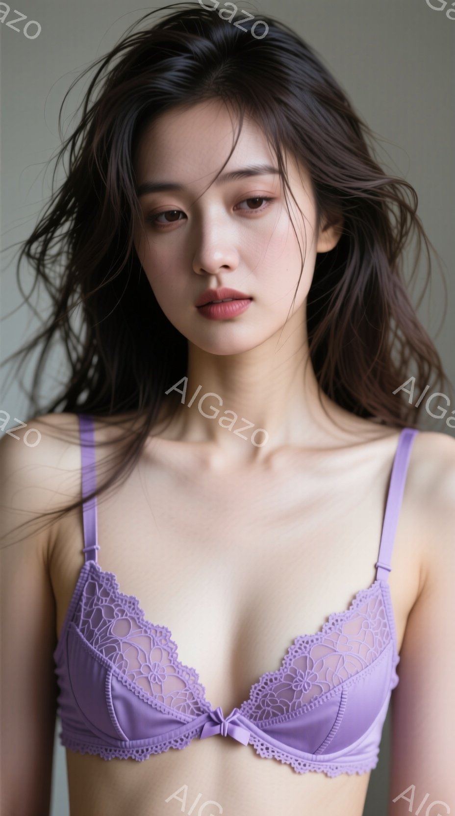 「長い黒髪の女性が、白いレースのブラレットを着用し、わずかに微笑んでいます。彼女は少し顔を傾げ、リラックスした姿勢で立っており、その表情は穏やかで魅力的です。背景」は、2025年11月27日に作成されたAI生成画像です。 ファッションをテーマとした高品質なビジュアル素材で、 928×1664px の解像度で提供しています。 個人利用・商用利用ともに無料でダウンロード可能で、クレジット表記も不要です。