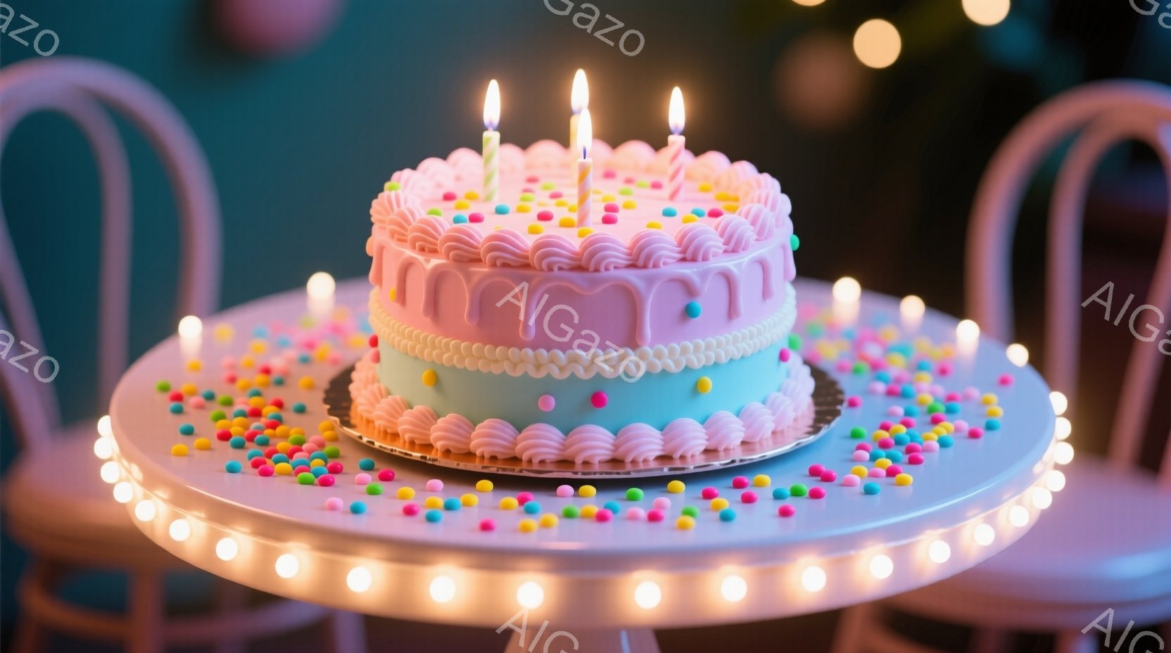 鮮やかなピンクと水色のデコレーションが施されたバースデーケーキが、白いテーブルの中央に置かれています。ケーキの上には2本のろうそくが灯り、テーブルの周りにはカラフルなスプリンクルが散りばめられています。背景は淡いピンク色の壁で、軽やかな光のイルミネーションが飾り付けられています。