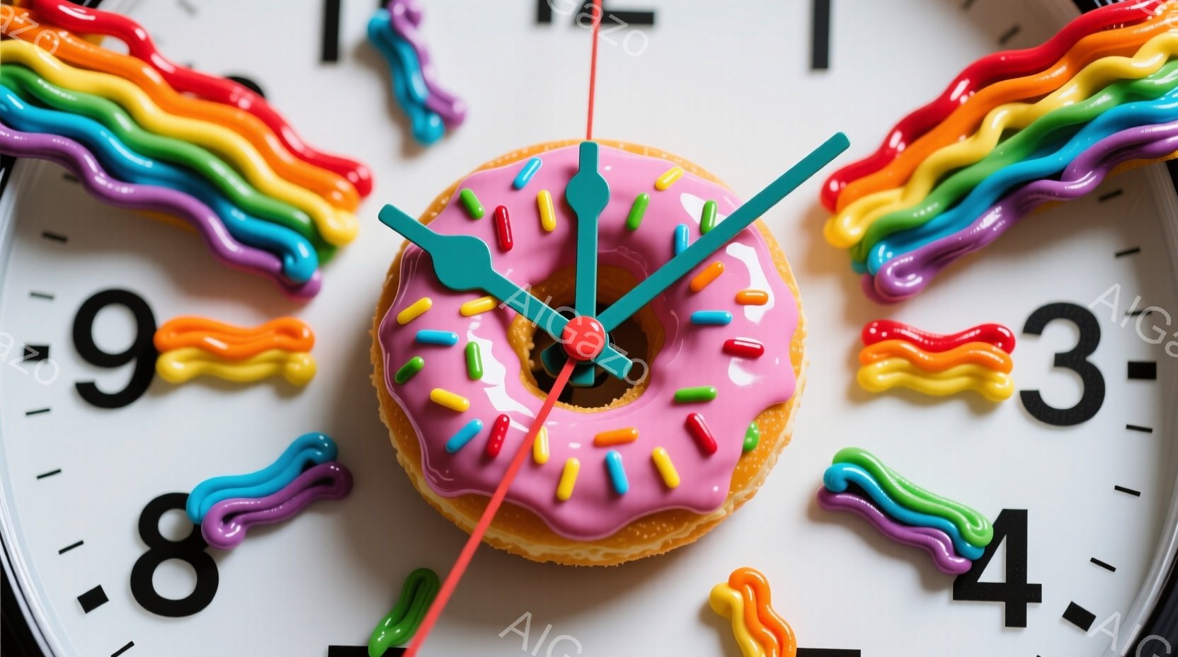 白い文字盤の時計が写っており、時間を示す針が取り付けられています。時計の数字の代わりに、カラフルなアイシングとスプリンクルで飾られたドーナツが取り付けられており、時間を示す代わりにその甘いお菓子が配置されています。ドーナツと針の鮮やかな色彩は、遊び心のある楽しい雰囲気を醸し出しています。