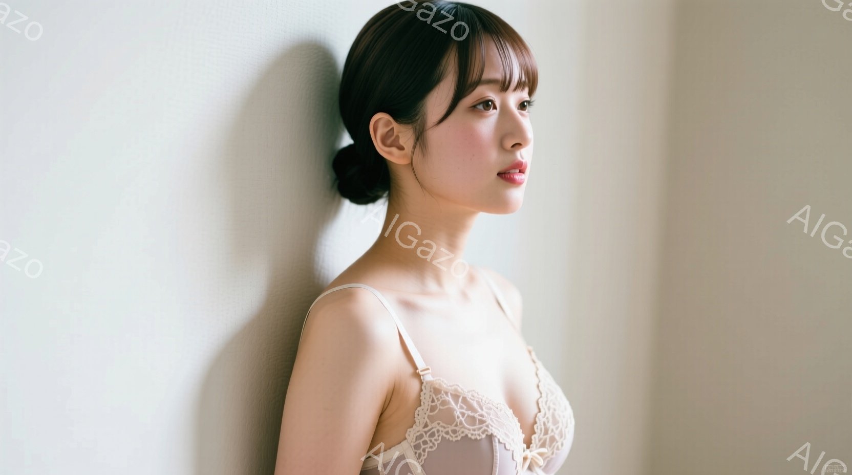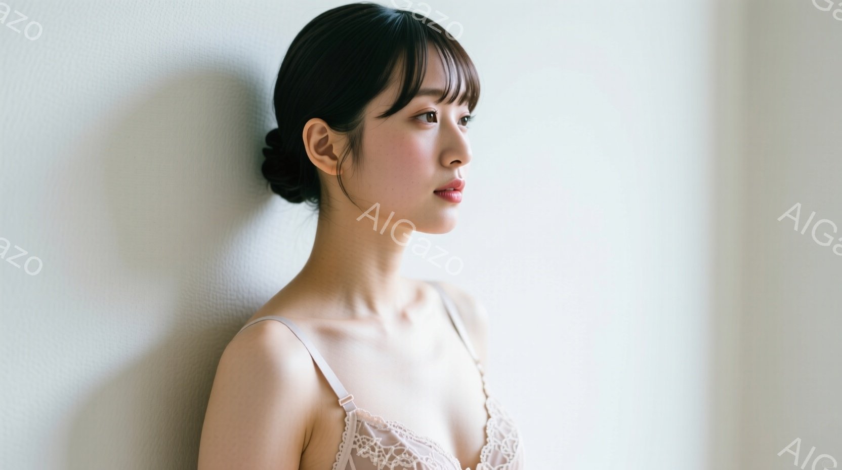 明るい背景を背にした若い女性が写っている。彼女は肩出しのレース装飾が施されたキャミソールを着ており、前髪を少しカールさせたロングヘアを後ろでまとめて、横を向いて少し憂いを帯びた表情をしている。 全体的に柔らかく、繊細な雰囲気が漂っている。