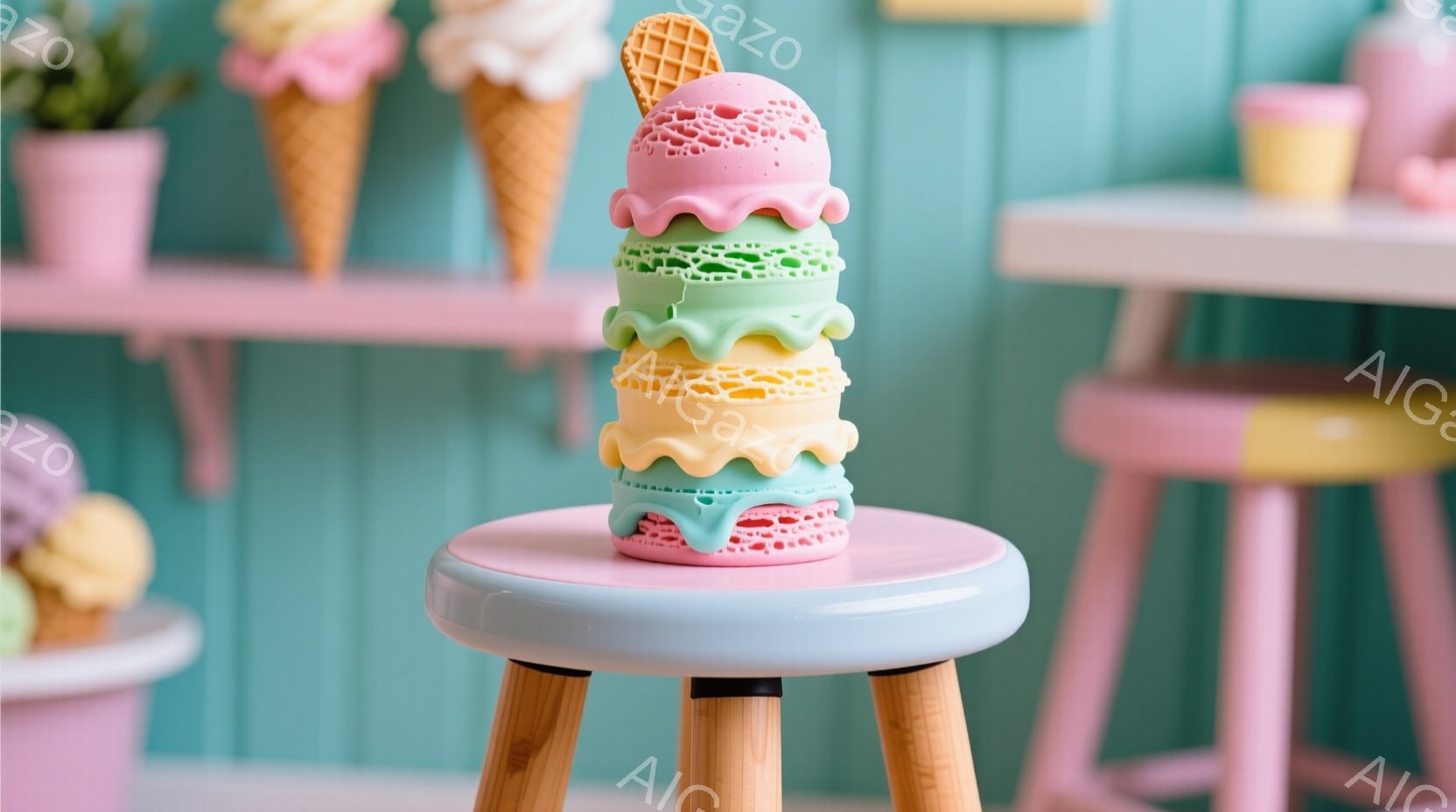 ターコイズブルーの背景に、木製の三本脚の椅子が置かれています。その椅子の上には、ピンク、緑、黄色、紫色の積み重ねられたおもちゃのような物体があり、まるでソフトクリームのようです。背景には、パステルカラーのストライプの壁と、カラフルな旗のガーランドが見え、遊び心のある楽しい雰囲気を醸し出しています。