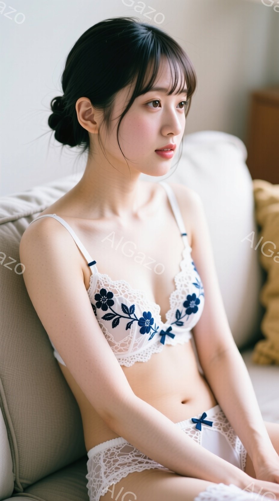 「長い黒髪をセンターパートにした女性が、白いレースのブラとショーツ、そして膝丈の白ストッキングを身に着けてベッドに座っています。彼女は微笑んでおり、リラックスした」は、2025年11月27日に作成されたAI生成画像です。 ショーツをテーマとした高品質なビジュアル素材で、 928×1664px の解像度で提供しています。 個人利用・商用利用ともに無料でダウンロード可能で、クレジット表記も不要です。