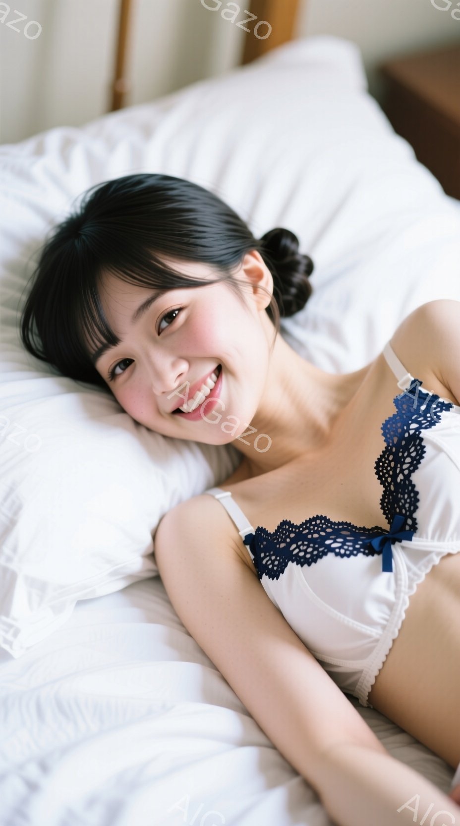 黒髪の女性が、白いフリル付きのブラジャーとパンツのセットを身に着けて座っています。彼女は穏やかな表情で、少し微笑んでいるように見えます。背景には白いチェストと壁があり、全体的に柔らかく清潔感のある雰囲気が漂っています。