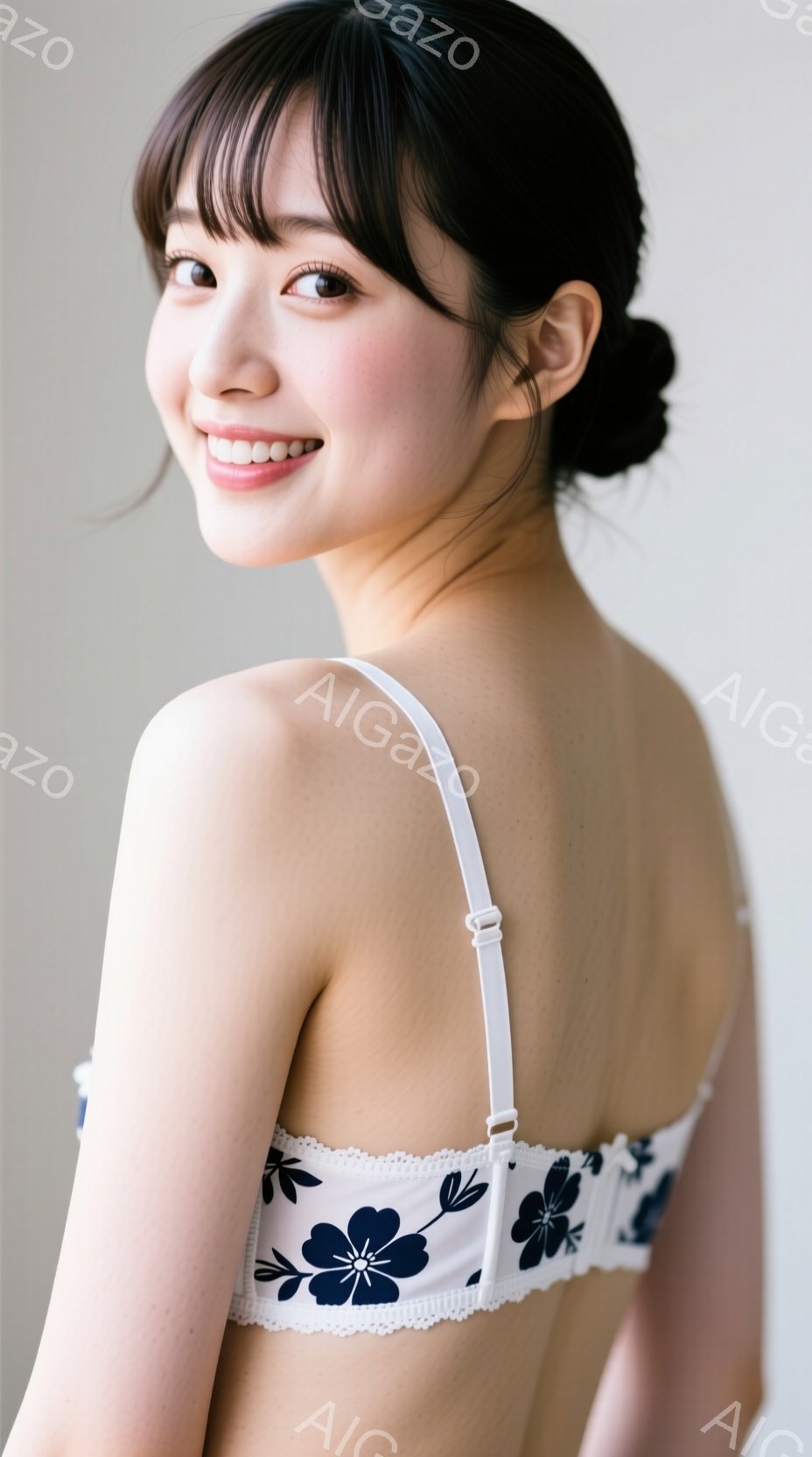 長い黒髪を後ろでまとめ、白い花柄のブラレットを着用した若い女性が写っています。彼女は少し微笑み、カメラの方を見ており、姿勢はリラックスしています。背景は淡い色で、人物が際立っており、全体的に清潔で明るい印象です。