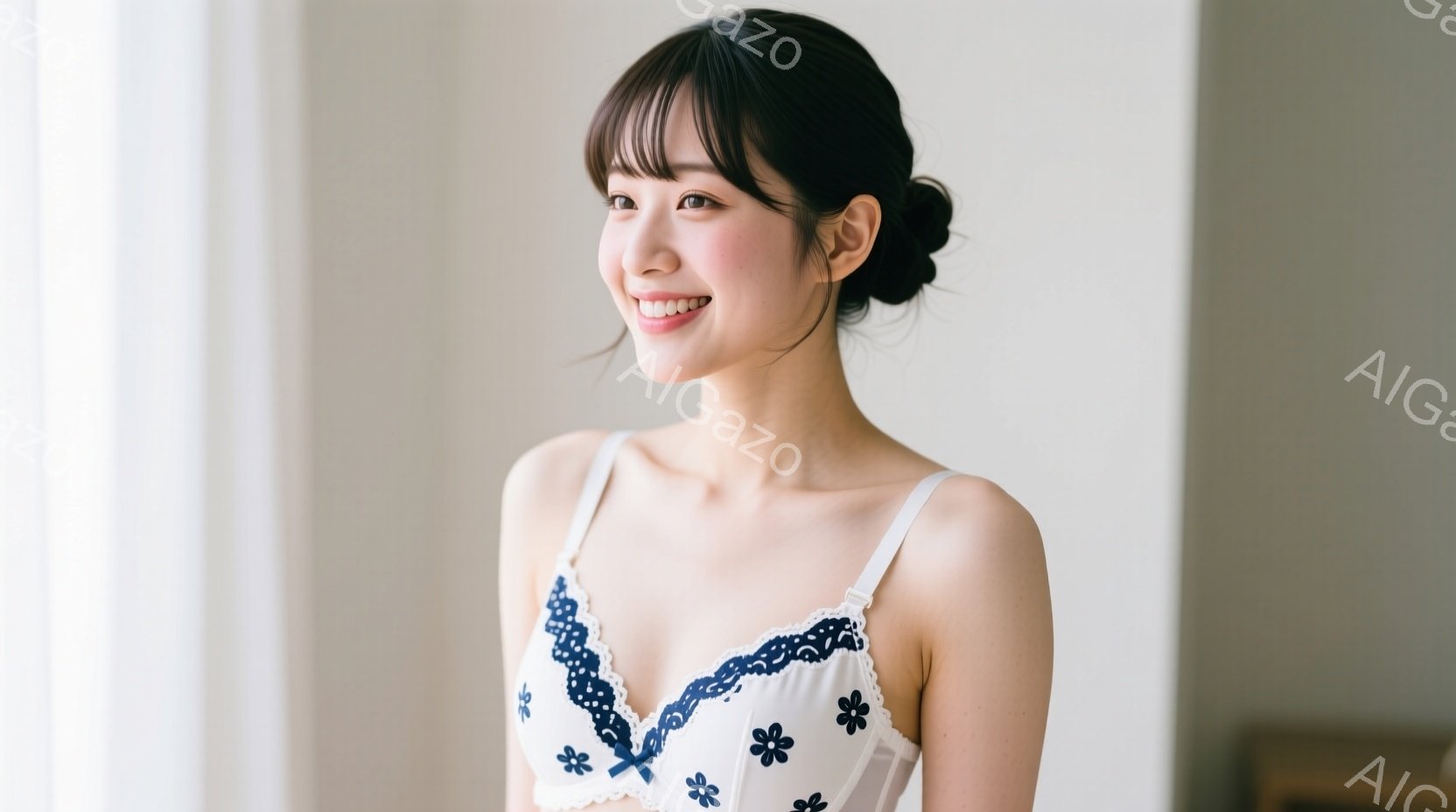 白地に青い花柄のブラレットを着た若い女性が、窓辺で微笑んでいます。彼女は肩を少し落としたリラックスした姿勢で、黒髪のロングヘアを耳にかけるようにしています。背景は明るいベージュ色の壁とシンプルな家具で、穏やかで柔らかい雰囲気が漂っています。