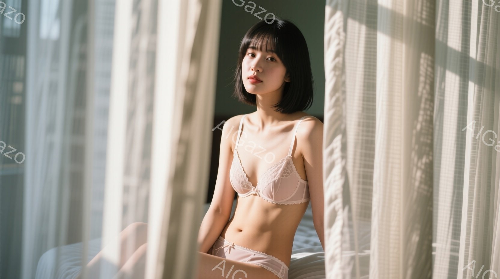 「白いタンクトップを着た若い女性が、白いベッドに横たわって天井を見上げています。彼女は黒いショートヘアで、リラックスした表情で目を閉じかけています。背景には大きな」は、2025年11月27日に作成されたAI生成画像です。 ベッドをテーマとした高品質なビジュアル素材で、 1664×928px の解像度で提供しています。 個人利用・商用利用ともに無料でダウンロード可能で、クレジット表記も不要です。