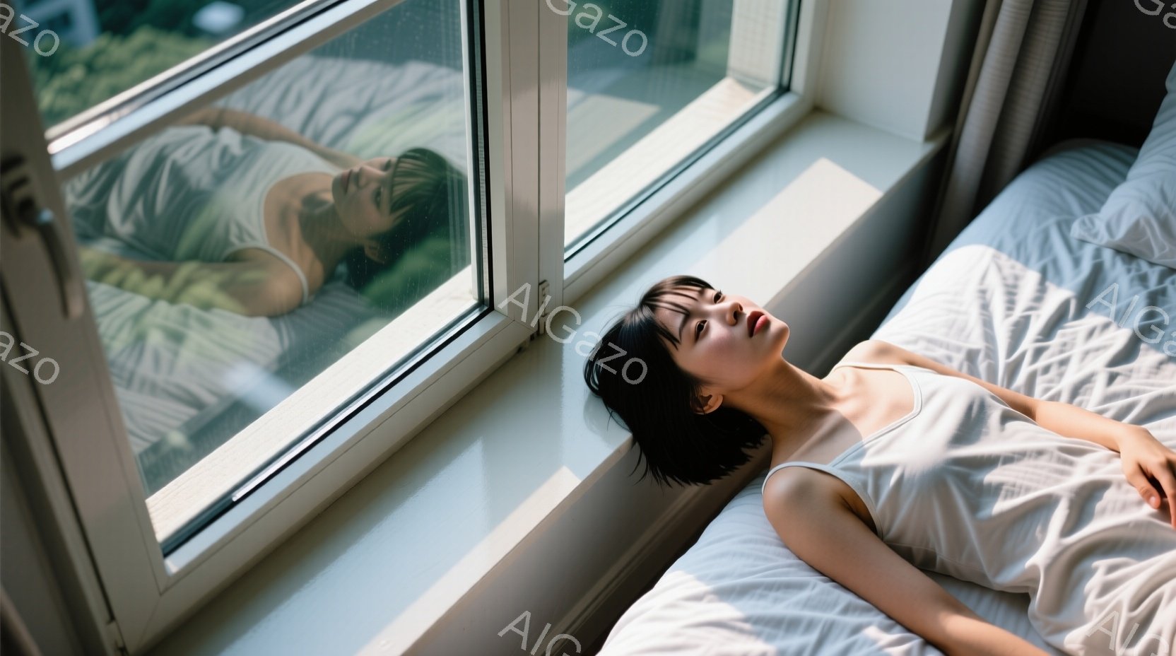 黒髪の女性がベッドに横たわり、薄いベージュ色のキャミソールを着ています。彼女は目を閉じ、リラックスした表情で、窓から差し込む光が彼女の横顔を照らしています。背景には緑豊かな木々が見え、晴れた日の穏やかな雰囲気が漂っています。