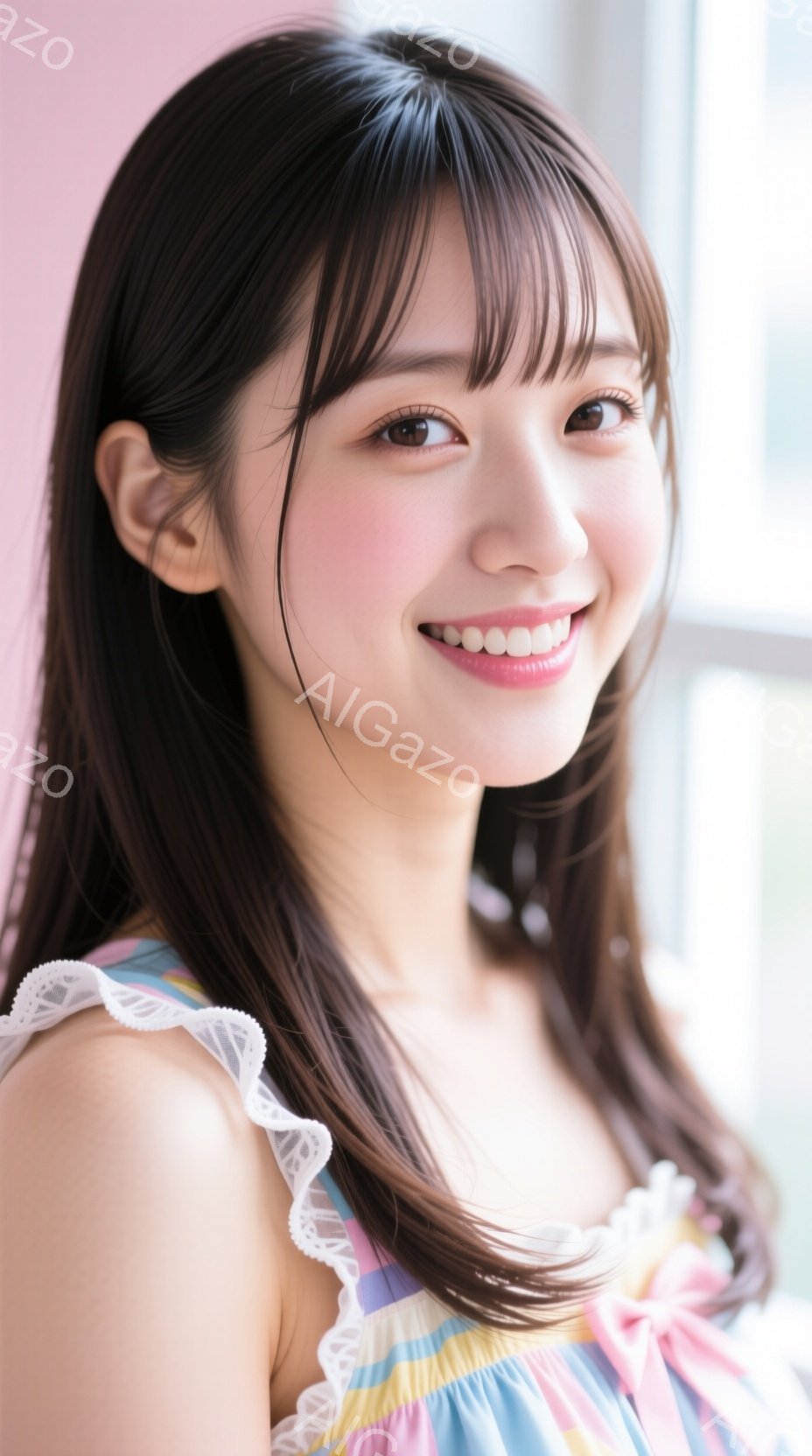 「明るい茶髪のショートボブヘアの女性が写っています。彼女はピンクとカラフルなストライプのキャミソールを着ており、顔には穏やかな笑顔が浮かんでいます。背景はぼやけて」は、2025年11月27日に作成されたAI生成画像です。 キャミソールをテーマとした高品質なビジュアル素材で、 928×1664px の解像度で提供しています。 個人利用・商用利用ともに無料でダウンロード可能で、クレジット表記も不要です。
