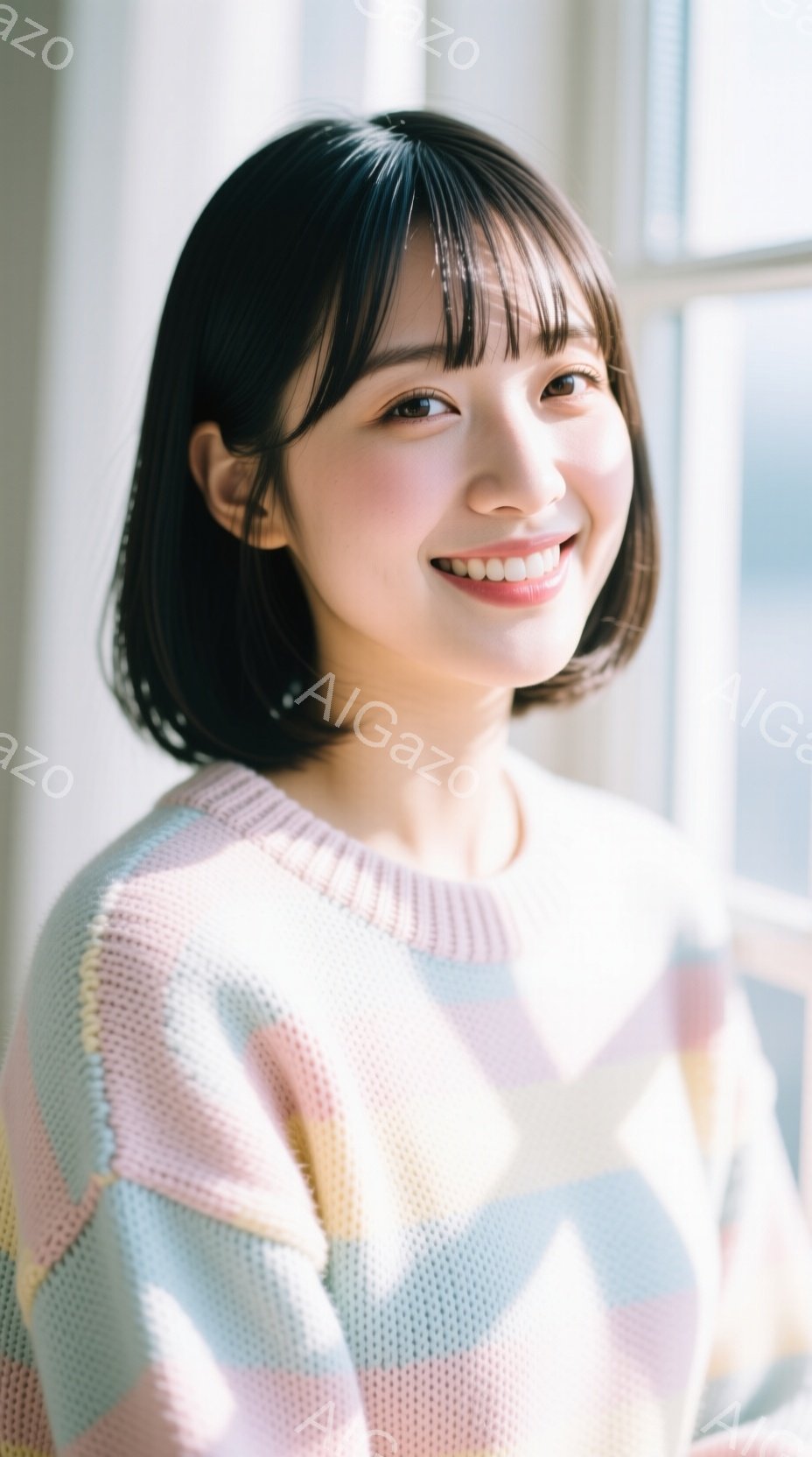 「明るい表情の若い女性が写っています。彼女は、ピンクと水色のストライプのセーターを着ており、肩までの長さの黒髪をしています。背景はぼやけていますが、窓からの自然光」は、2025年11月27日に作成されたAI生成画像です。 カジュアルをテーマとした高品質なビジュアル素材で、 928×1664px の解像度で提供しています。 個人利用・商用利用ともに無料でダウンロード可能で、クレジット表記も不要です。