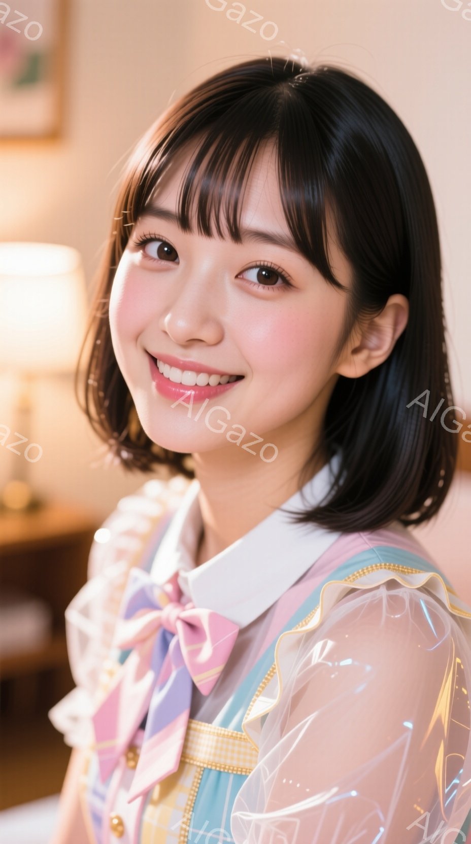 この女性は、明るいブルーとピンクのストライプが入ったフリル付きのワンピースを着ています。黒髪のボブスタイルで、顔には微笑みが浮かび、優しい印象を与えています。背景はぼやけていますが、室内で暖色系の照明の下にいることがわかります。