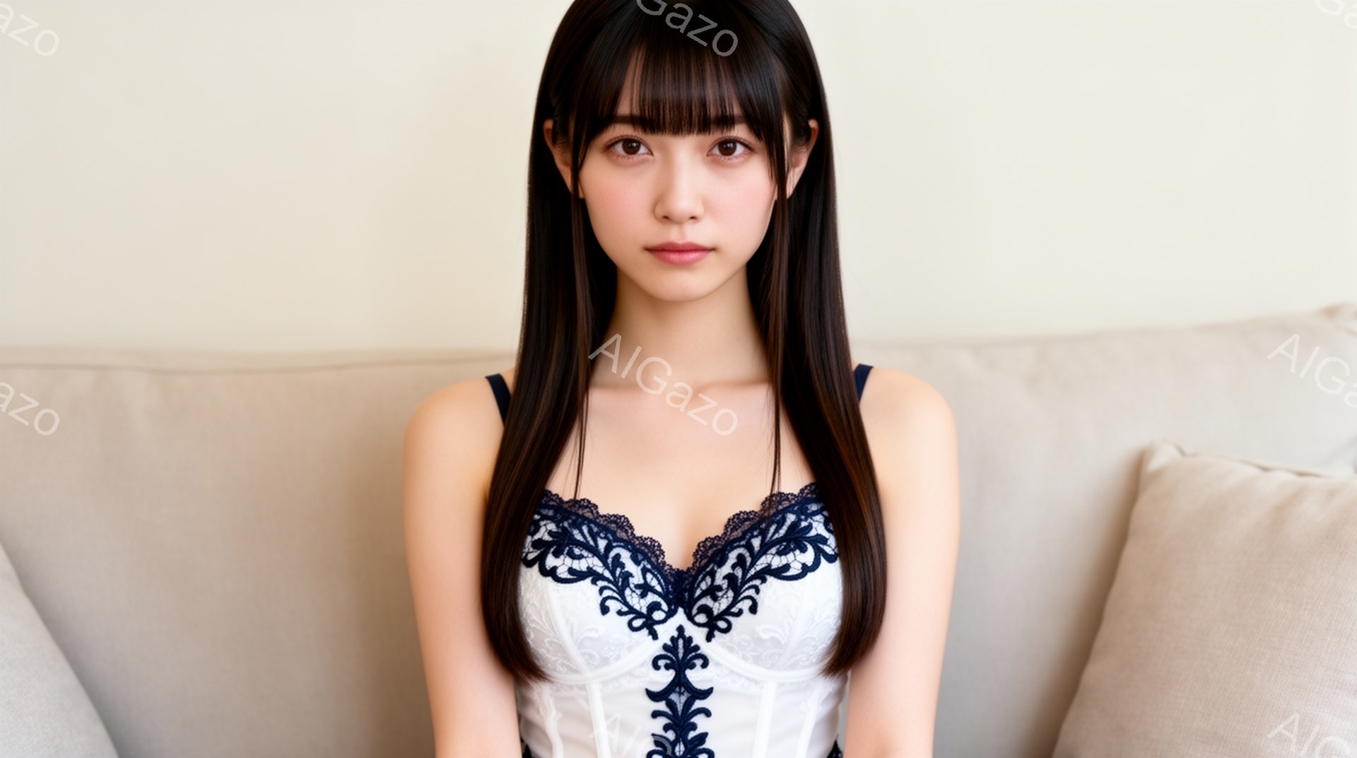 「白いベッドに横たわる女性が写っています。彼女はレースが縁取られた白いキャミソールと紺色のブラジャーを身に着けており、髪は後ろでまとめられています。微笑みを浮かべ」は、2025年11月28日に作成されたAI生成画像です。 ファッションをテーマとした高品質なビジュアル素材で、 1920×1072px の解像度で提供しています。 個人利用・商用利用ともに無料でダウンロード可能で、クレジット表記も不要です。