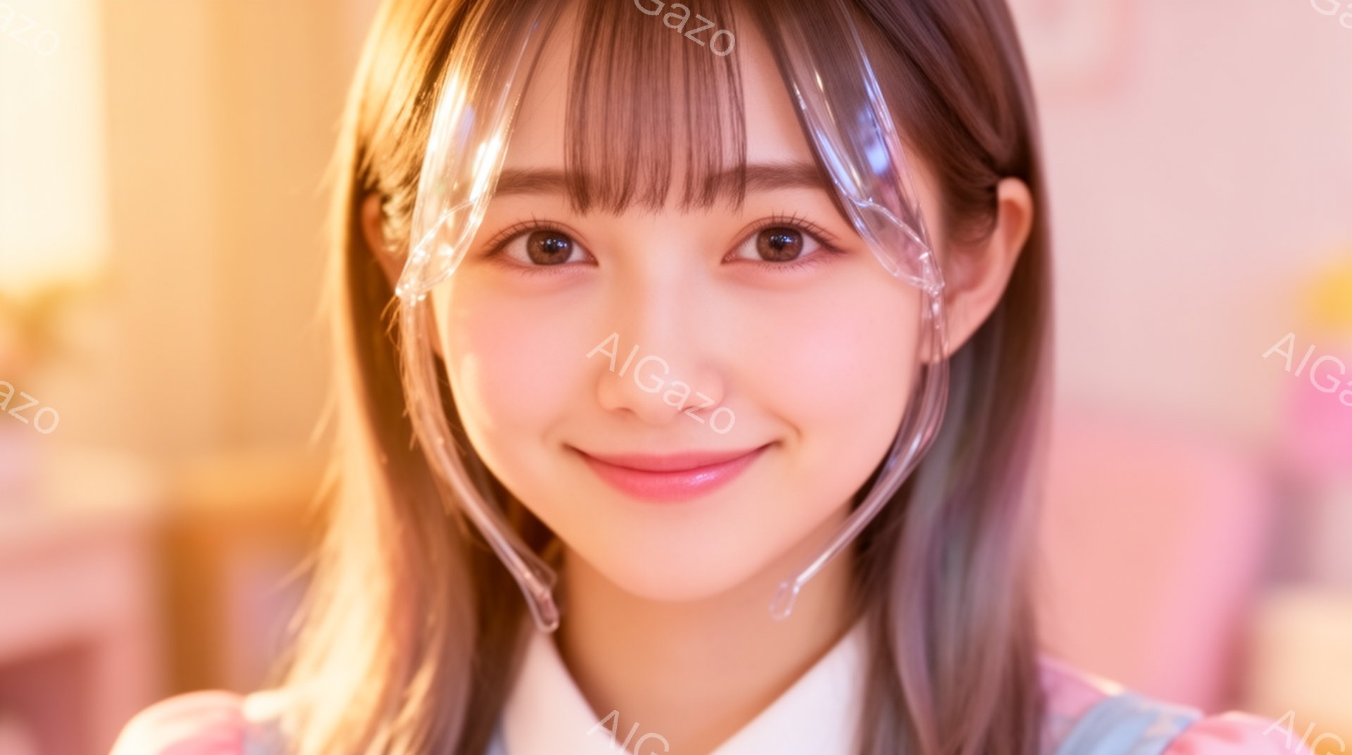 明るい茶色の髪の女性が、カメラに向かって微笑んでいます。彼女は肩まで届く長さの髪をしており、前髪には透明なヘアアクセサリーがついています。背景はぼやけていますが、ピンクがかった暖かい雰囲気で、室内であることがわかります。