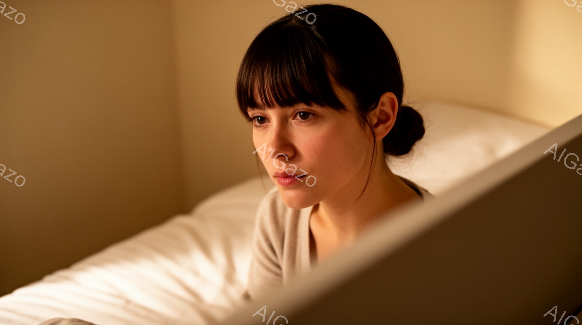 画像には、薄茶色のトップスを着た若い女性が写っています。彼女は髪を後ろでまとめ、少し物憂げな表情で何かを見つめています。背景はぼやけていますが、木製のフレームと白い寝具の一部が見え、穏やかで内省的な雰囲気が漂います。