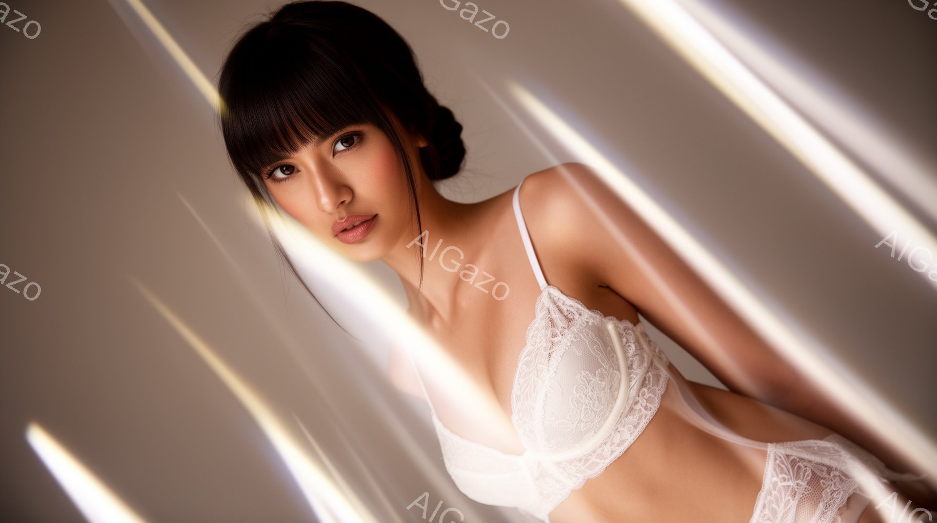 モデルは繊細なレースのブラレットを身に着け、髪を後ろでまとめ、カメラの方を少し斜めに見つめています。彼女の表情は優雅で、少し物憂げな雰囲気があります。背景は淡いグレーで、光の筋が斜めに走り、ドラマチックな雰囲気を醸し出しています。