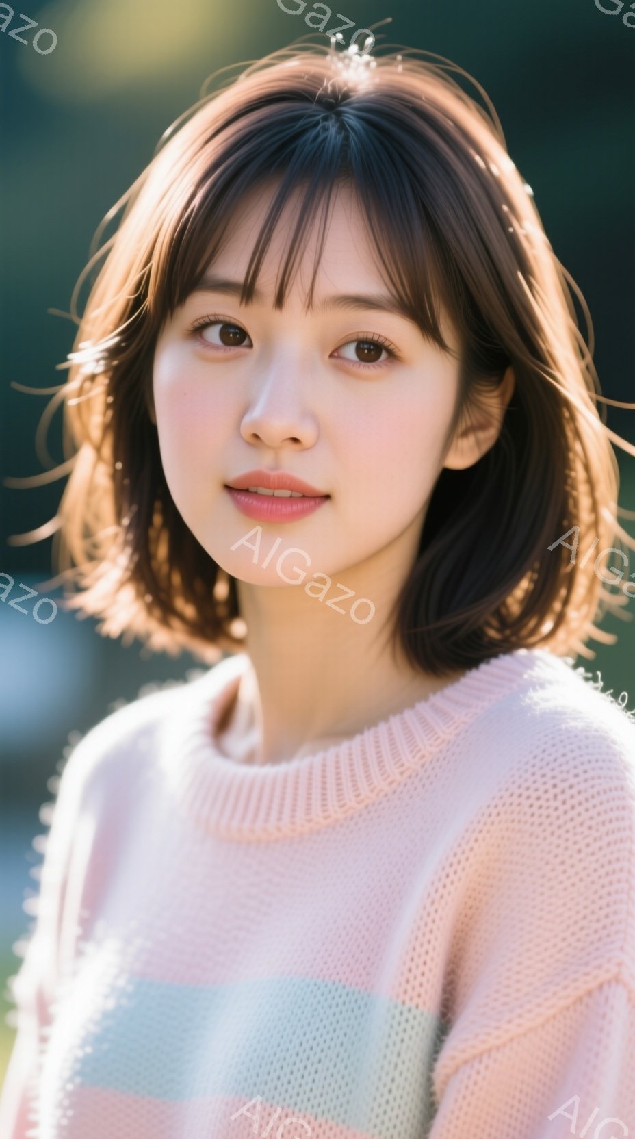 「ショートヘアの女性が写っており、ピンクと水色のブロック状のセーターを着ています。彼女はわずかに微笑んでおり、穏やかで優しい表情をしています。背景は緑豊かな自然で」は、2025年11月28日に作成されたAI生成画像です。 ショートヘアをテーマとした高品質なビジュアル素材で、 928×1664px の解像度で提供しています。 個人利用・商用利用ともに無料でダウンロード可能で、クレジット表記も不要です。