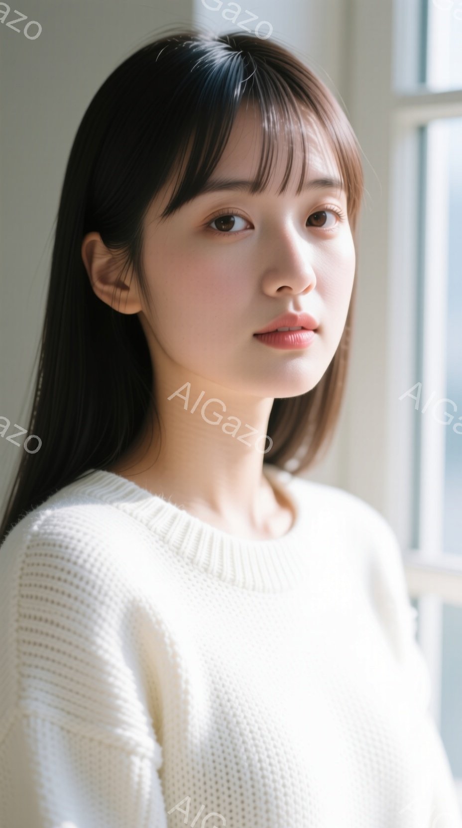 長い黒髪で、前髪は眉毛にかかるようにカットされた若い女性が写っています。白いセーターを着ており、表情は穏やかで少し微笑んでいるように見えます。背景はぼやけていますが、窓枠と光が差し込む壁の一部が見え、全体的に柔らかく温かい雰囲気です。
