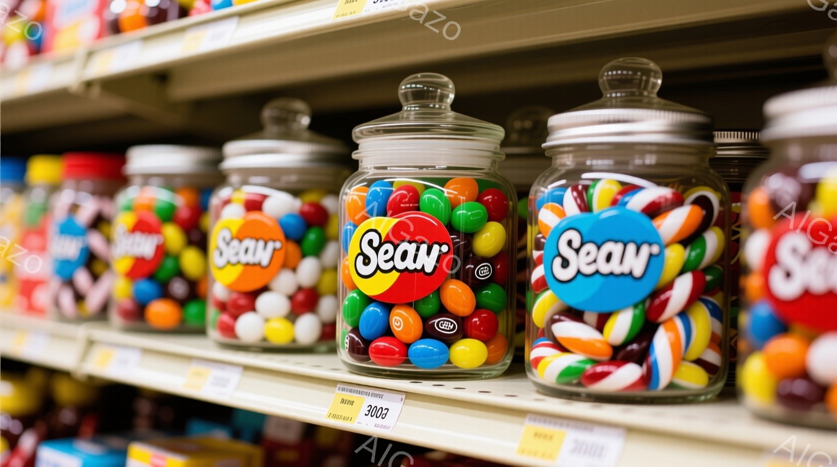 カラフルなキャンディーとグミが棚に並んでいます。大きなガラスの瓶には、さまざまな色の小さなグミがぎっしりと詰まっており、その手前には棒付きの渦巻き模様のキャンディーが並べられています。価格タグがいくつか見え、明るい店内の一角の様子が伺えます。
