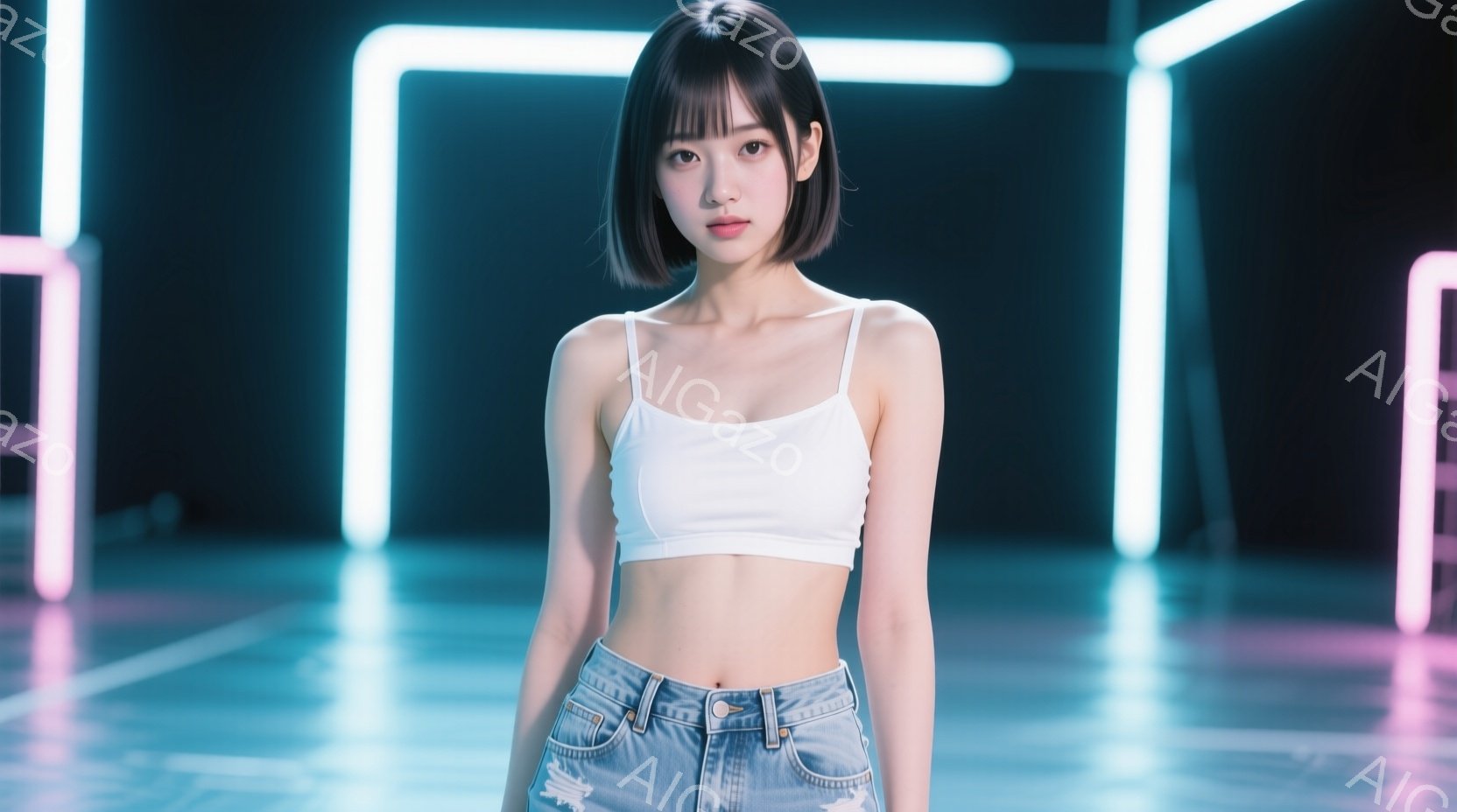 若い女性が、パステルピンクと水色のブラレットとデニムのショートパンツを着用して立っています。彼女は肩まで届くダークブラウンの髪で、前髪は眉毛にかかるようにカットされています。背景はシンプルな屋内空間で、柔らかな光が差し込んでおり、穏やかでリラックスした雰囲気を醸し出しています。