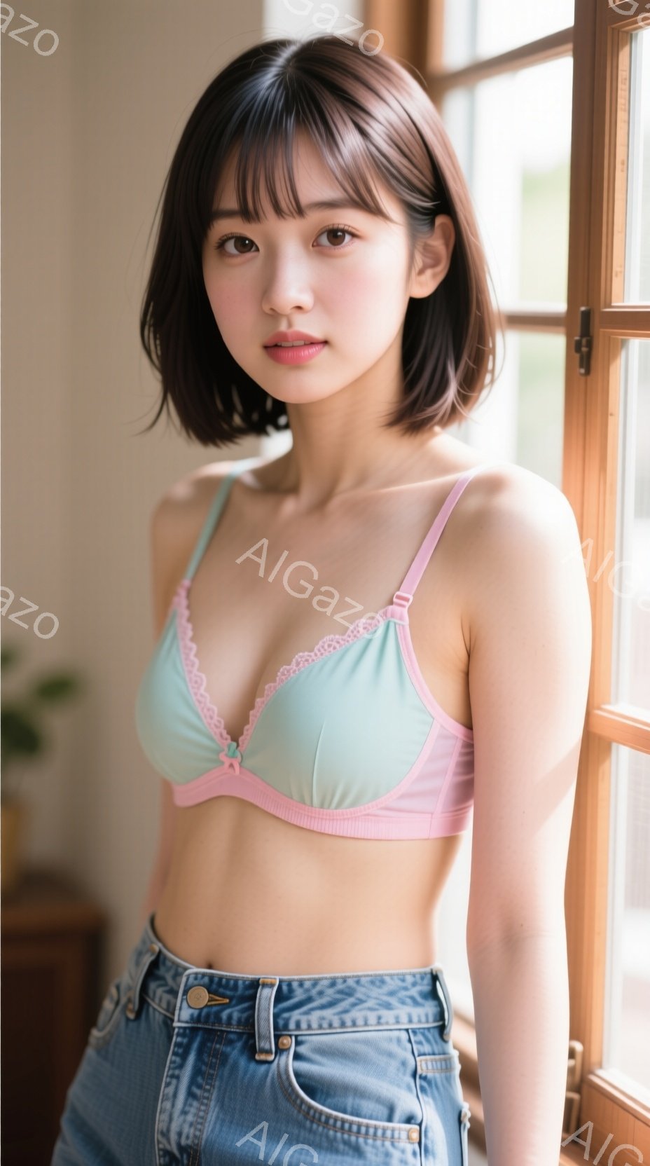 黒髪のボブヘアに前髪を下ろした若い女性が、薄い緑色のブラとデニムジーンズを身につけて立っています。彼女はわずかに微笑み、リラックスした表情で、窓のそばで自然光を浴びています。背景にはぼやけた窓枠と緑の植物が見え、全体的に柔らかく自然な雰囲気が漂っています。