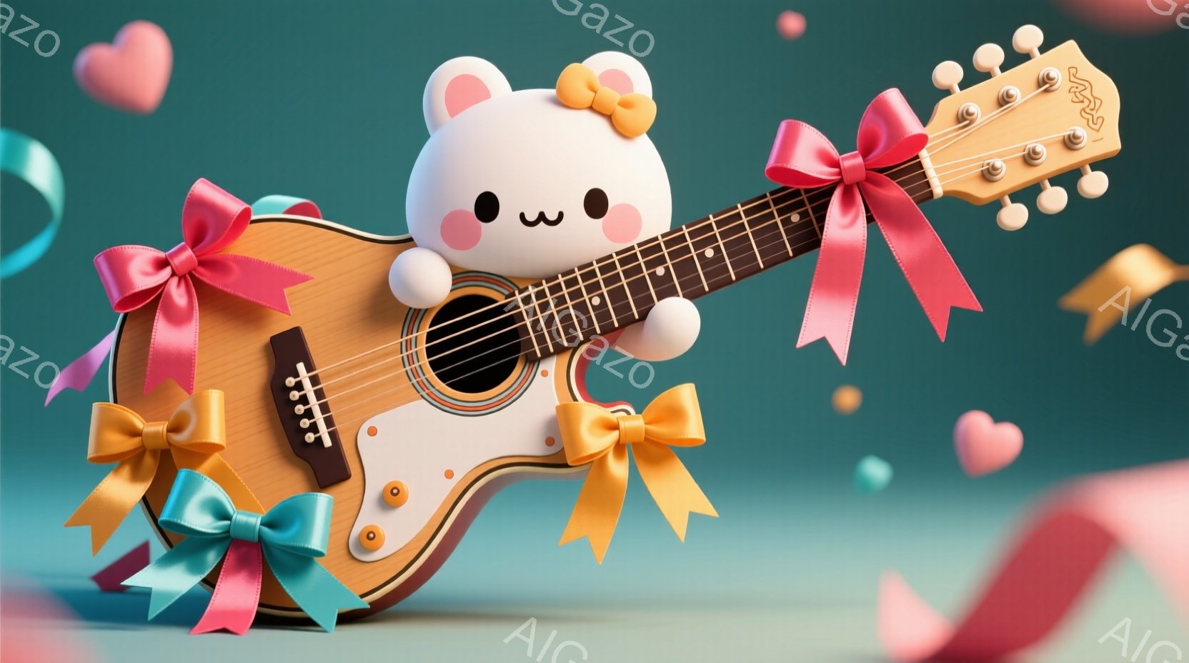 この無料AI生成画像「明るいピンク色の背景に、かわいらしい表情をしたウクレレが描かれています。ウクレレは頬が赤く、つぶらな瞳が特徴的で、首には水色のリボン、全体にピンクと黄色のリボンが飾られています。周囲には、同じ表情をした小さな丸いキャラクターが浮かんでおり、全体的に明るく楽しい雰囲気です。」は、2025年10月22日に作成されました。 サイズは 1664×928px の高解像度で、商用利用も可能なフリー素材として提供しています。