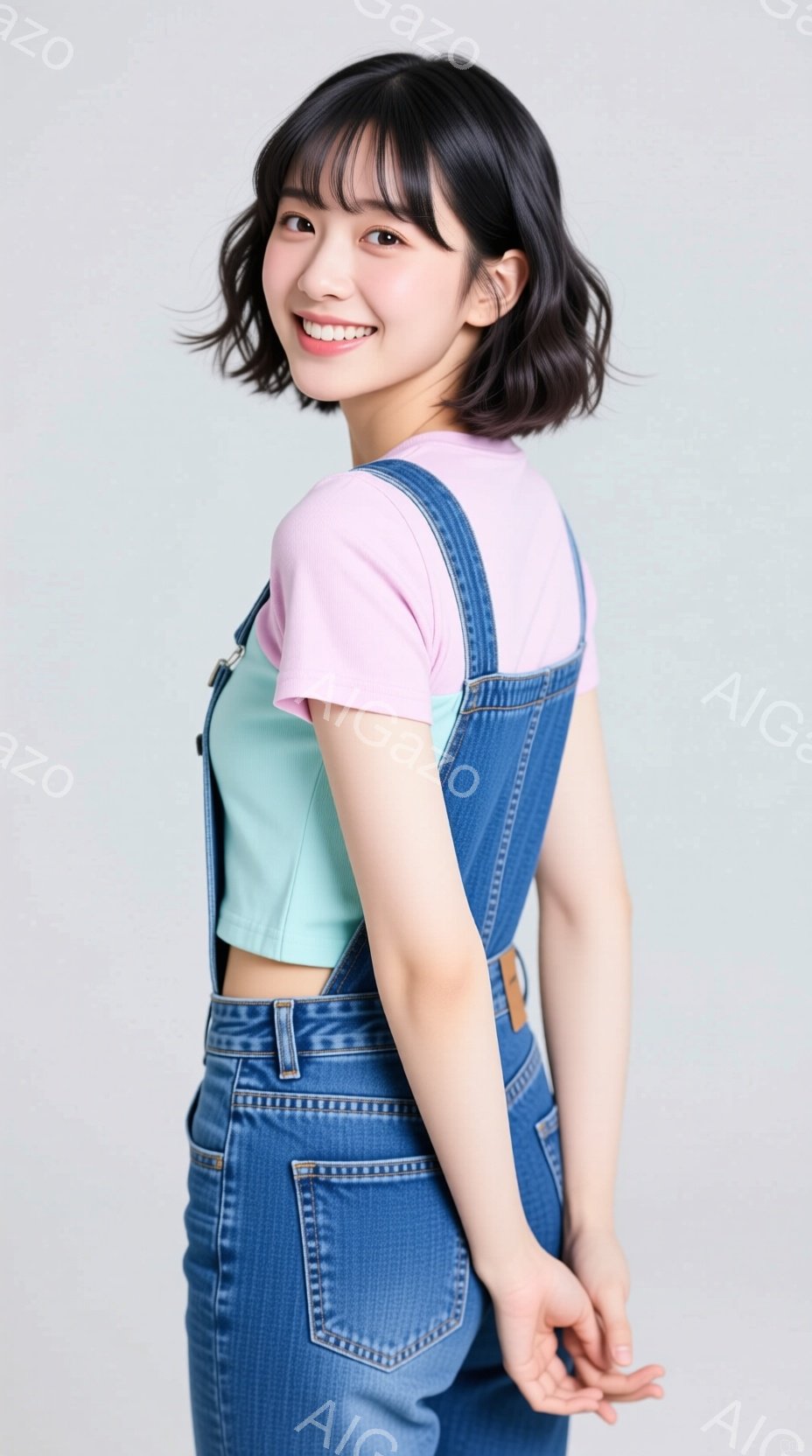 「若い女性がデニムオーバーオールとピンクと水色のストライプのTシャツを着て、少し振り返って微笑んでいます。彼女は短い前髪と肩までの長さの髪を持ち、リラックスしたポ」は、2025年11月28日に作成されたAI生成画像です。 カジュアルをテーマとした高品質なビジュアル素材で、 928×1664px の解像度で提供しています。 個人利用・商用利用ともに無料でダウンロード可能で、クレジット表記も不要です。