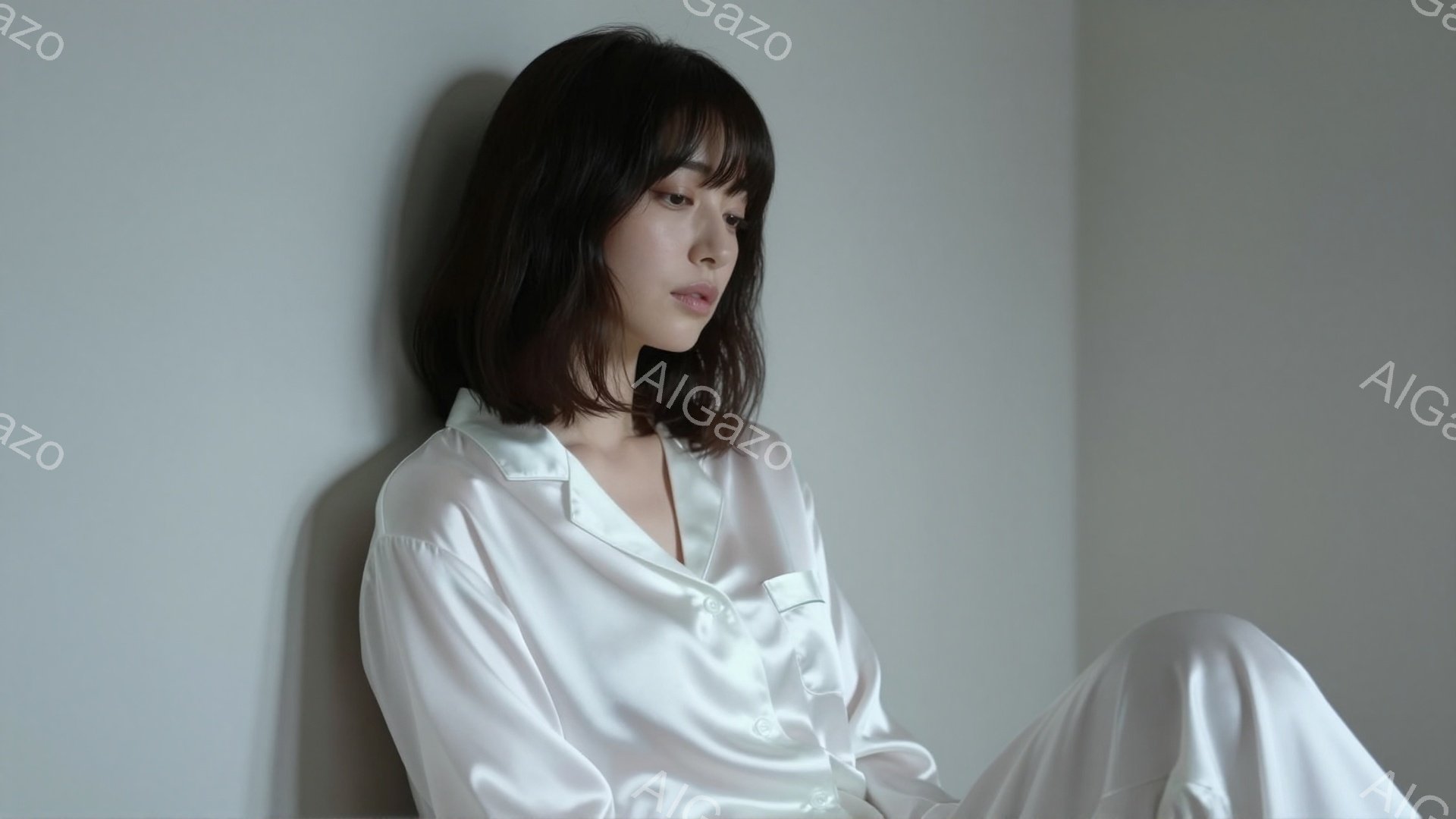 画像は、滑らかな質感の白いブラウスを着た若い女性を捉えています。彼女は肩までの長さのストレートヘアで、前髪が眉毛にかかっています。表情は穏やかで、少し物憂げな視線をどこか遠くへ向けています。