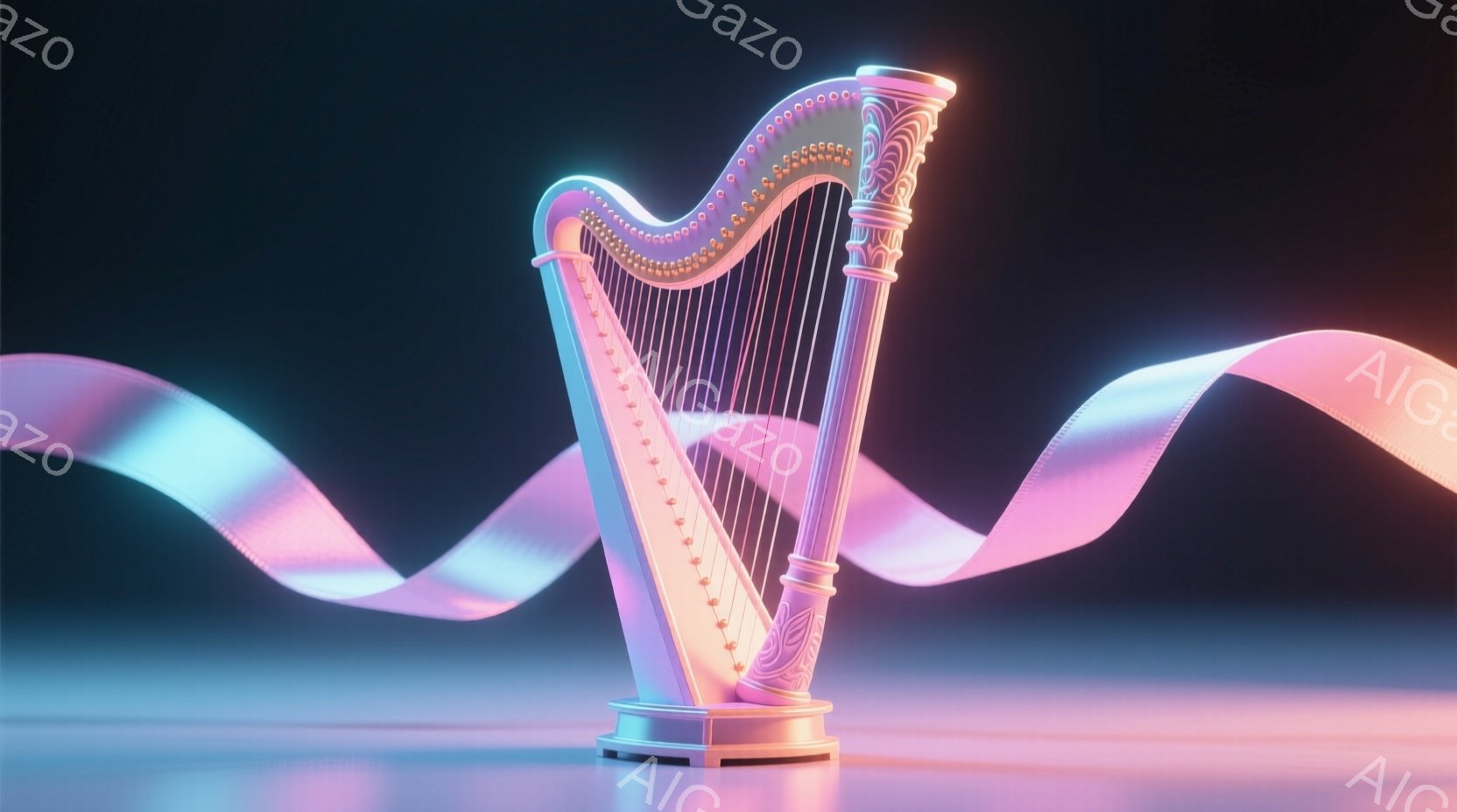 鮮やかなピンクと紫の光が照らすハープが印象的な画像です。ハープは光沢のある白地に、金色の装飾が施されており、その優雅な曲線と多数の弦が美しい旋律を想像させます。背景はぼやけたグラデーションで、ハープが浮かび上がるような幻想的な雰囲気を醸し出しています。