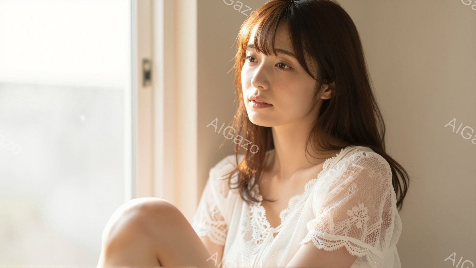 柔らかい日差しが差し込む窓辺で、女性が膝を抱えて座っている。オフホワイトの繊細なレースが施されたキャミソールを着ており、肩を露出している。彼女は茶色のボブヘアで、穏やかな微笑みを浮かべ、リラックスした表情をしている。