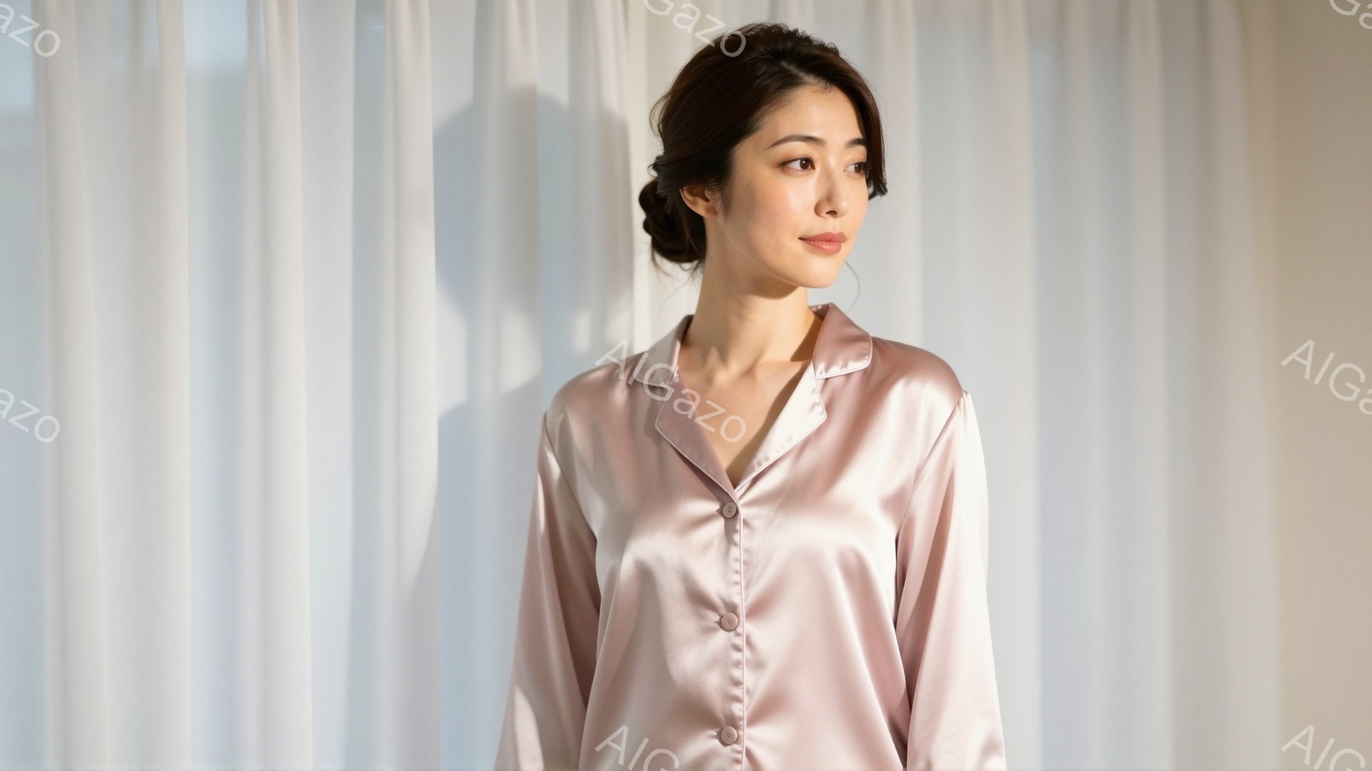 明るい室内で、女性が窓辺に立っている。彼女は光沢のあるピンク色のパジャマを着ており、髪は後ろでまとめられている。穏やかな表情で、どこか遠くを見つめている様子から、静かで穏やかな雰囲気が漂う。