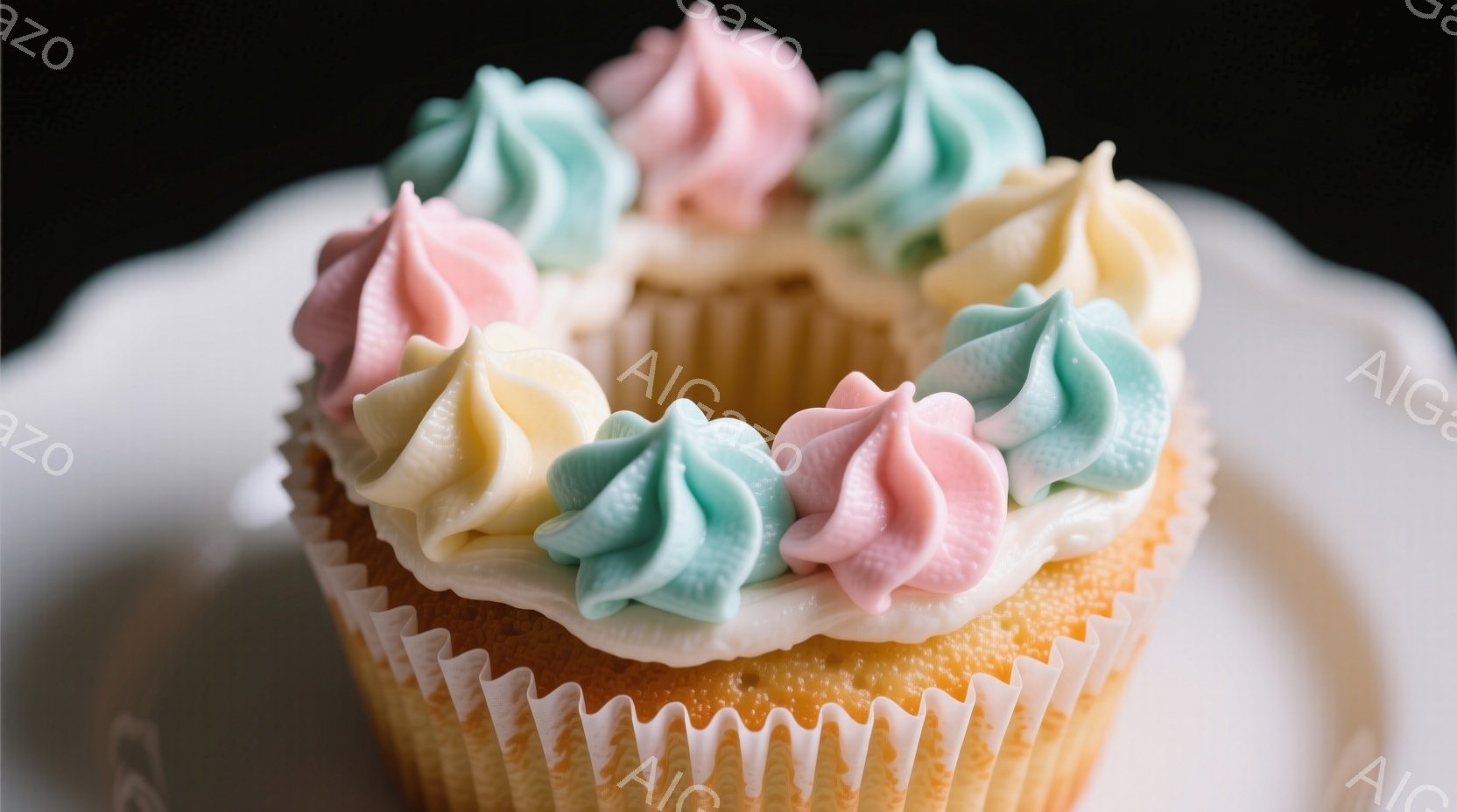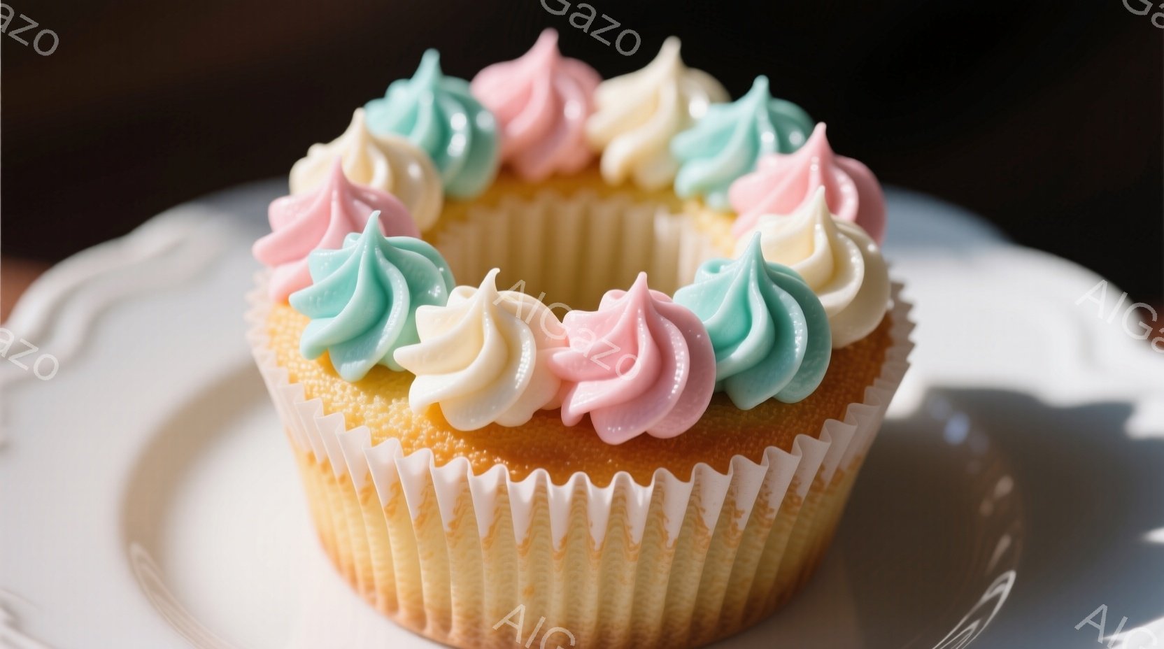 白い皿の上に、カラフルなクリームを乗せたカップケーキが置かれています。クリームはピンク、水色、紫、黄色と優しいパステルカラーで、まるで花びらのように飾られています。カップケーキの周りには、小さなカラフルなスプリンクルが散りばめられ、明るく可愛らしい雰囲気を醸し出しています。
