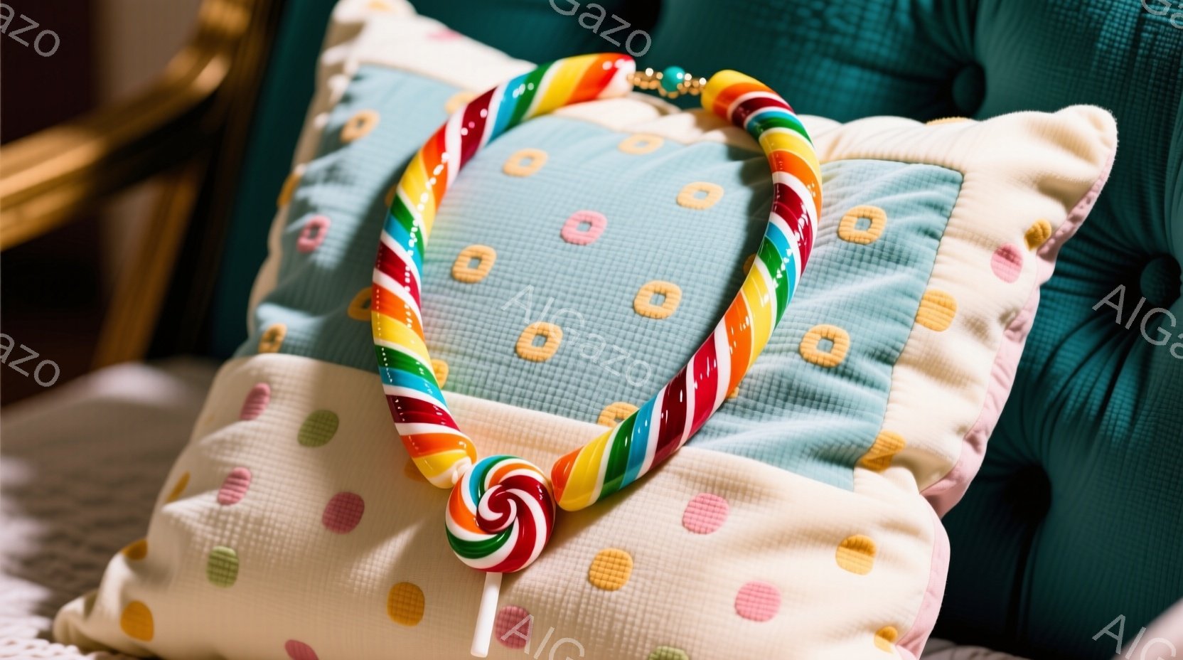 カラフルなキャンディが連なったネックレスが、淡いベージュ色のクッションの上に置かれています。クッションはフリンジが施されており、背景には青いベルベットのようなクッションと、カラフルな模様の敷物がわずかに見えます。全体的に明るく、遊び心のある、お祭りや子供向けのイベントを連想させる雰囲気です。
