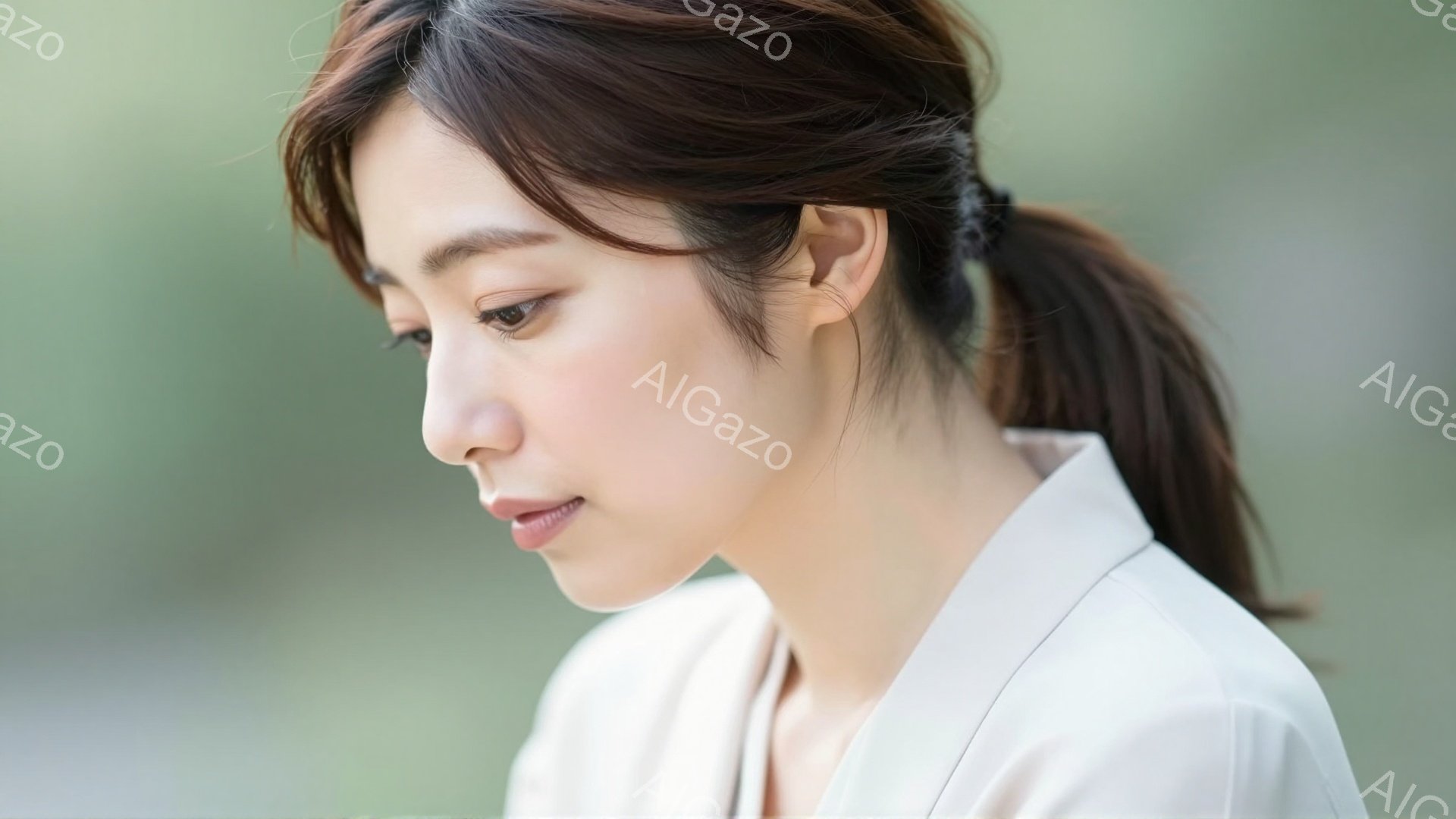 長い黒髪をハーフアップにした若い女性が写っています。白いブラウスを着ており、横顔で穏やかな微笑みを浮かべています。背景は緑色のぼやけた自然で、柔らかい光が彼女を照らし、優しい雰囲気を醸し出しています。