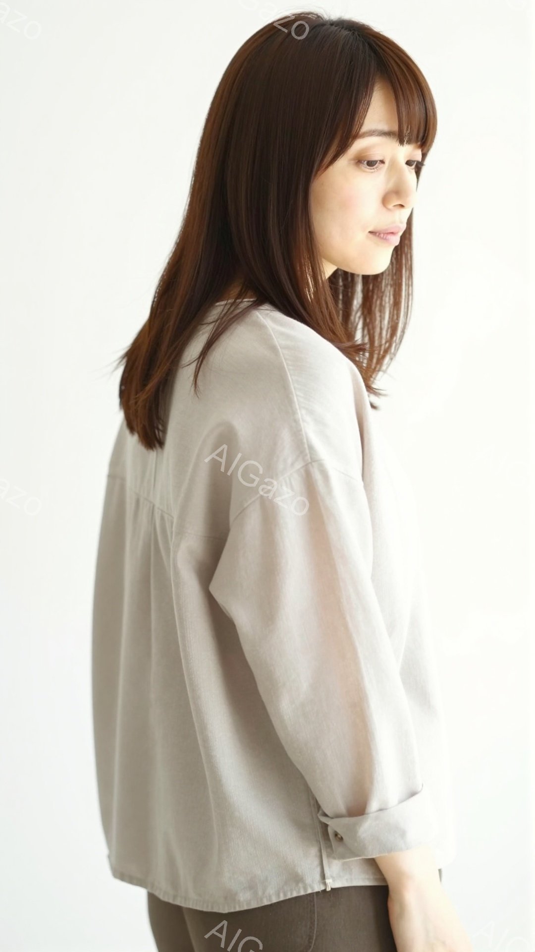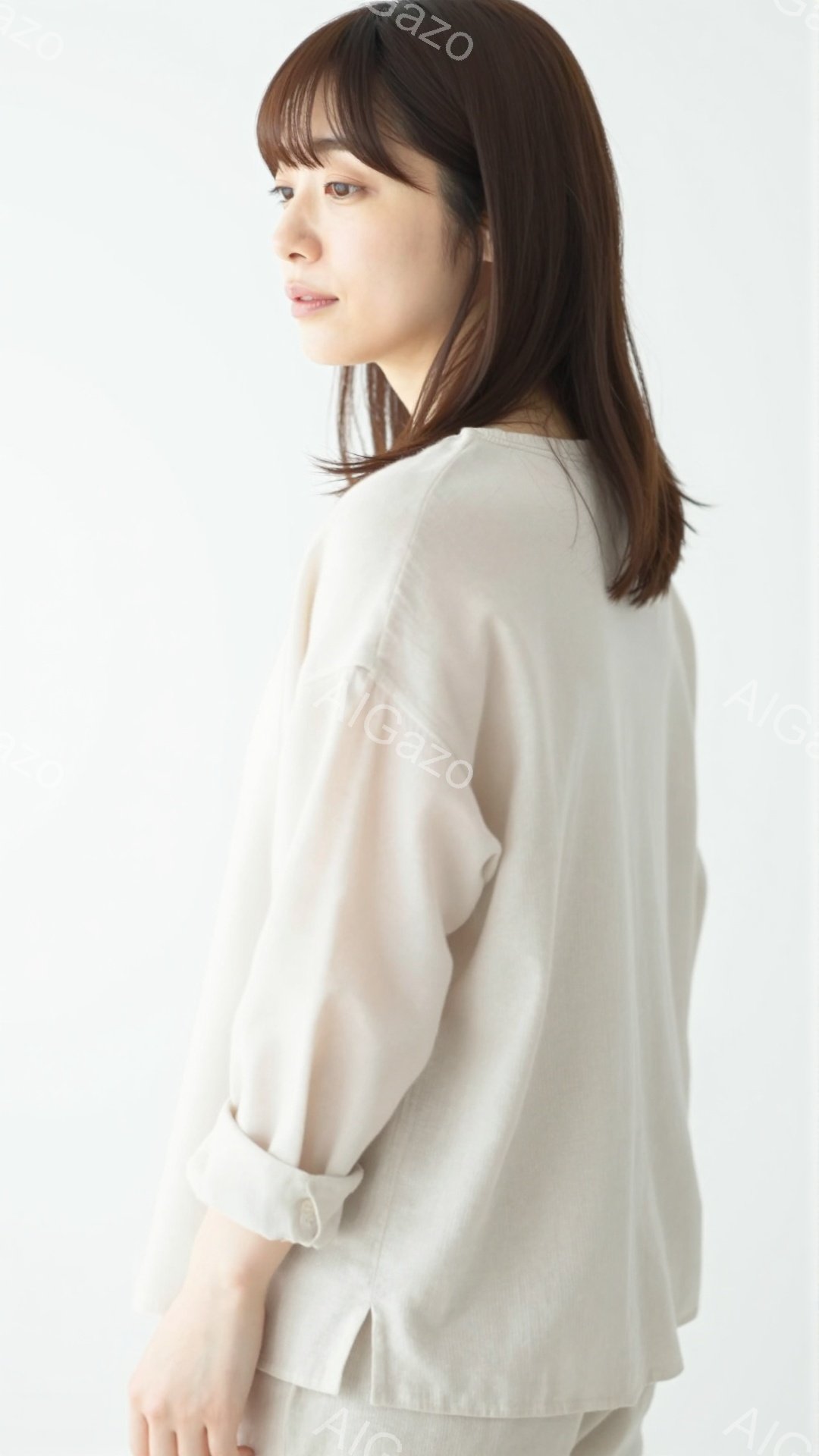 「画像は、ベージュ色のゆったりとしたブラウスとパンツを身に着けた女性を横から捉えています。彼女は肩までの長さの黒髪で、表情は穏やかで、やや下を向いています。背景は」は、2025年11月28日に作成されたAI生成画像です。 おしゃれをテーマとした高品質なビジュアル素材で、 1080×1920px の解像度で提供しています。 個人利用・商用利用ともに無料でダウンロード可能で、クレジット表記も不要です。