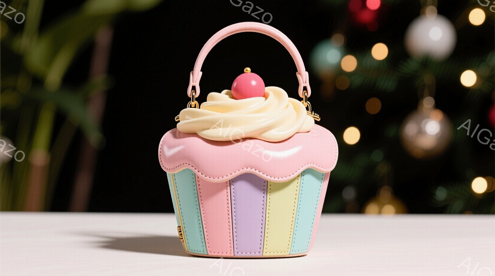 鮮やかなピンク色のカップケーキを模したハンドバッグが、明るい背景のテーブルの上に置かれています。クリーム部分はラベンダー色で、カラフルなスプリンクルが飾られ、赤いチェリーがトッピングされています。全体的にパステルカラーで、可愛らしく遊び心のある雰囲気が漂っています。