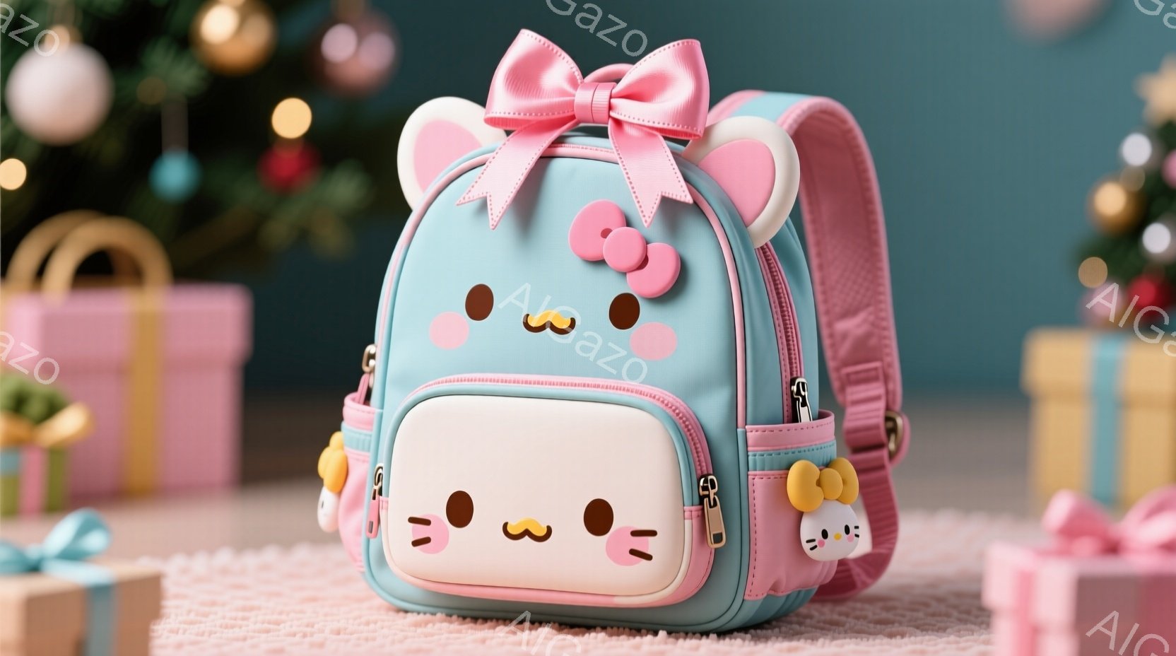 パステルピンクと水色の可愛らしい猫をモチーフにした子供用リュックサックが写っています。リュックサックには猫の顔が描かれており、立体的なリボンと猫の足がアクセントになっています。背景には、パステルカラーのプレゼントボックスと、白く可愛らしい花が飾られています。