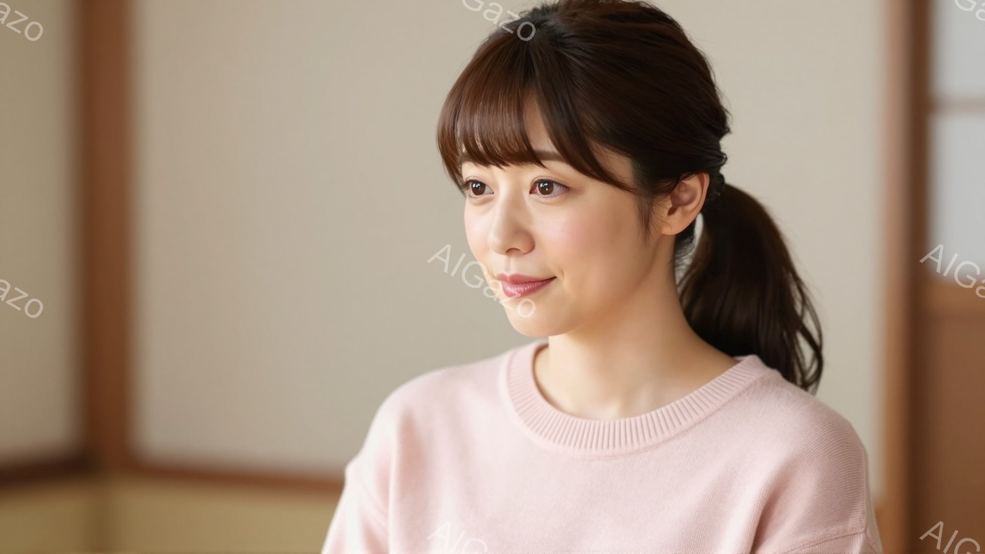 「明るいピンク色のセーターを着た若い女性が写っています。彼女は前髪を少し長めにして、ポニーテールにしています。彼女の表情は穏やかで、何かを考えているかのような、優」は、2025年11月28日に作成されたAI生成画像です。 セーターをテーマとした高品質なビジュアル素材で、 1920×1080px の解像度で提供しています。 個人利用・商用利用ともに無料でダウンロード可能で、クレジット表記も不要です。