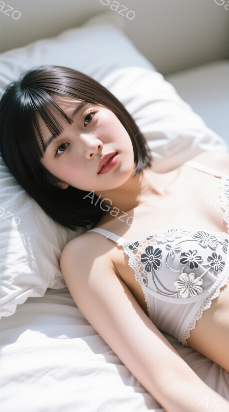 黒髪のショートヘアで、白いレースのブラレットを身につけた女性が、白いシーツの上に仰向けに横たわっています。彼女はわずかに微笑み、リラックスした表情でカメラを見つめています。背景はぼやけており、部屋の一部の様子が見えますが、全体的に柔らかく穏やかな雰囲気が漂っています。