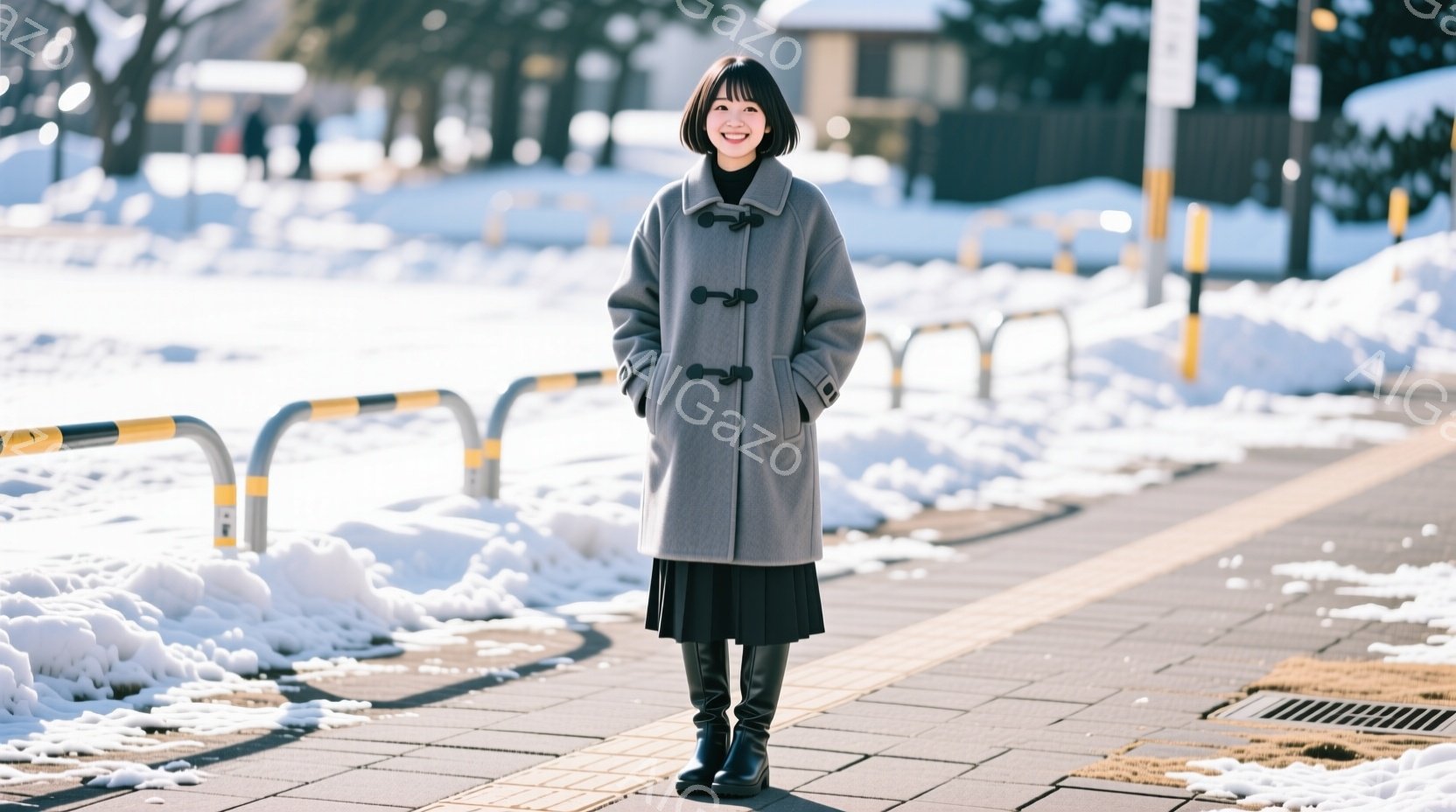 長い黒髪の女性が、淡いピンク、水色、クリーム色のストライプのニットワンピースと黒いブーツを着用し、雪景色の中で笑顔で立っています。彼女はわずかに体を傾け、片手を上げており、リラックスしたポーズです。背景には雪に覆われた木々と白い風景が広がり、明るい日差しが差し込み、暖かく穏やかな雰囲気を醸し出しています。