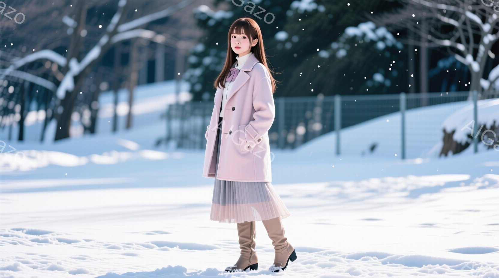 淡いピンク色のコートを着た女性が雪景色の中に立っている。ふわふわのスカートと黒いブーツを合わせ、髪は肩にかかる長さで、正面を向いて微笑んでいる。背景には雪で覆われた木々が広がり、冬の静かで穏やかな雰囲気を醸し出している。