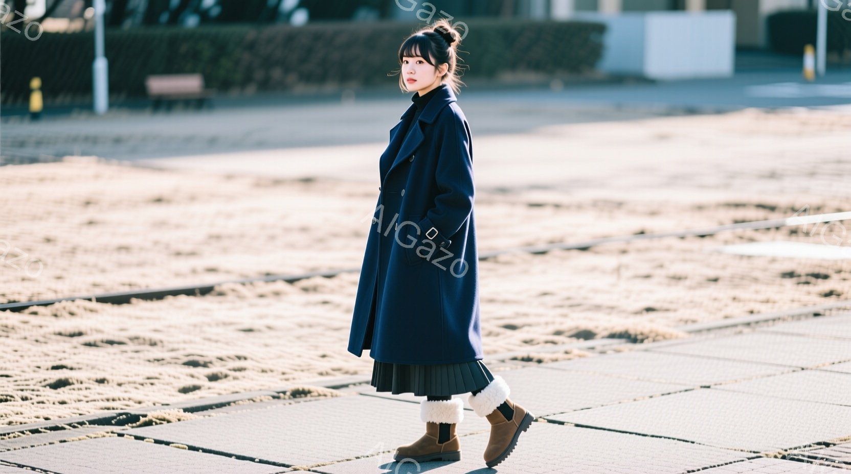 「白いセーターと黒いプリーツスカート、黒いブーツを履いた若い女性が雪の中を走っている。彼女は両手を上げて笑顔で、明るく元気な印象を与える。背景には雪に覆われた木々」は、2025年11月29日に作成されたAI生成画像です。 スカートをテーマとした高品質なビジュアル素材で、 1664×928px の解像度で提供しています。 個人利用・商用利用ともに無料でダウンロード可能で、クレジット表記も不要です。