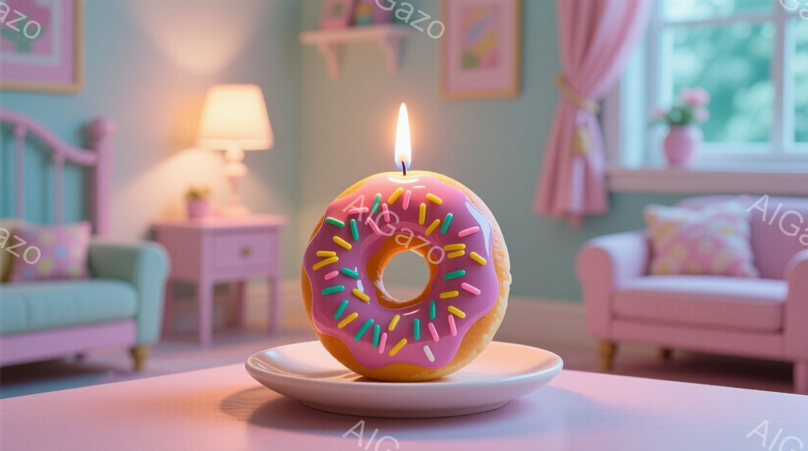 ピンク色のテーブルの上に、色とりどりのトッピングが施されたドーナツ型のキャンドルが置かれています。背景には、ピンクのベッドや植物、そして淡い色の壁が見え、温かく可愛らしい雰囲気が漂っています。 全体的にパステルカラーで統一され、お祝いや誕生日を連想させる、優しい印象の画像です。