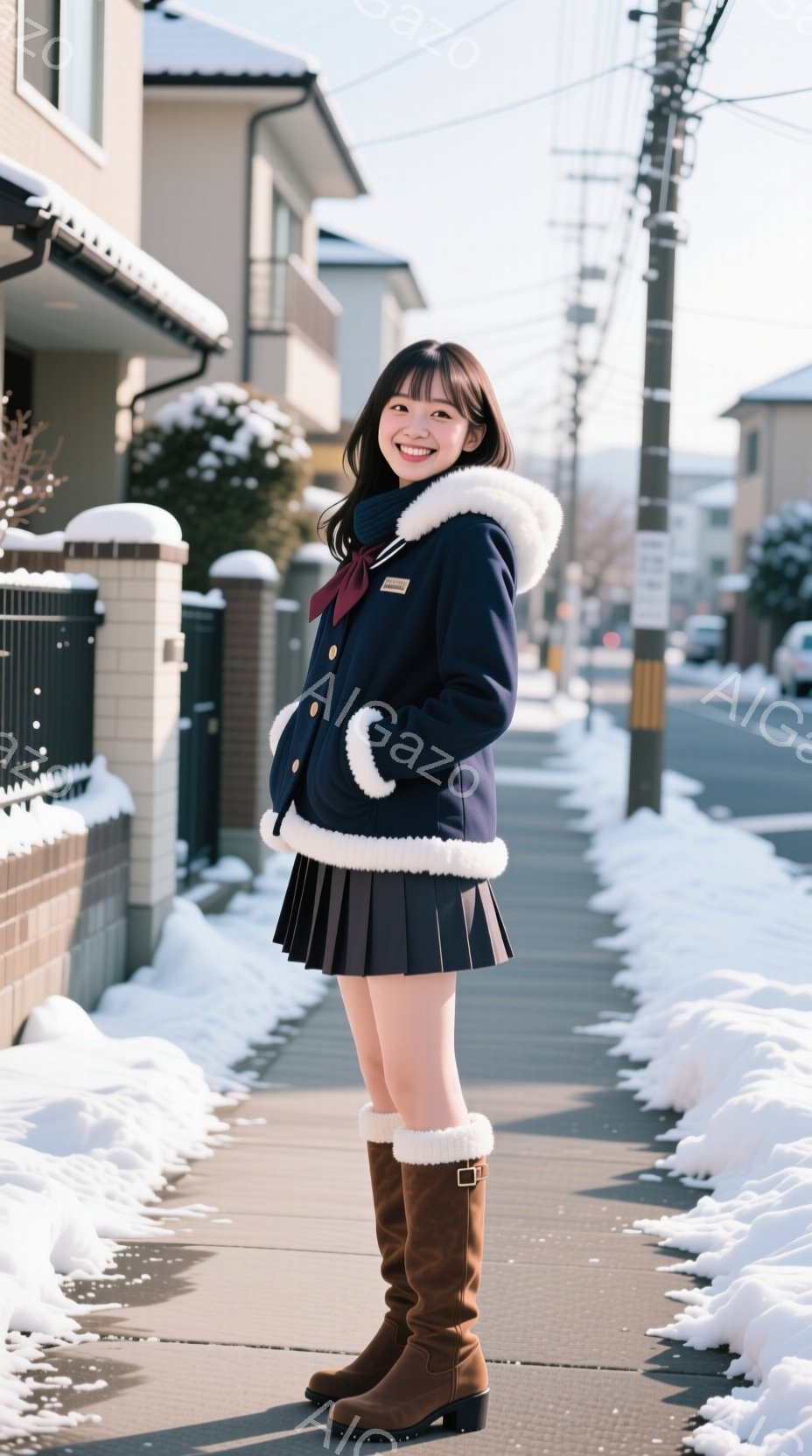 雪が積もる住宅街の歩道で、紺色の制服を着た女性がこちらを見ながら歩いている。彼女はショートヘアで、明るい笑顔を見せており、黒いロングブーツを履いている。背景には木々や家々が見え、冬の穏やかな雰囲気が漂っている。