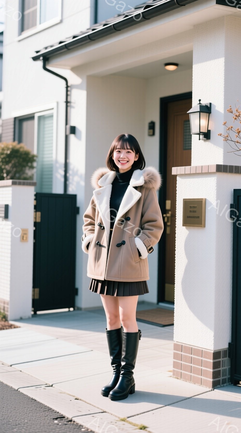 「ピンク色のコートに白いセーター、チェック柄のスカート、膝丈の黒いブーツを履いた女性が、雪の降る街路を軽快にスキップしている。彼女は明るい笑顔を浮かべ、片手を上げ」は、2025年11月29日に作成されたAI生成画像です。 コートをテーマとした高品質なビジュアル素材で、 1664×928px の解像度で提供しています。 個人利用・商用利用ともに無料でダウンロード可能で、クレジット表記も不要です。